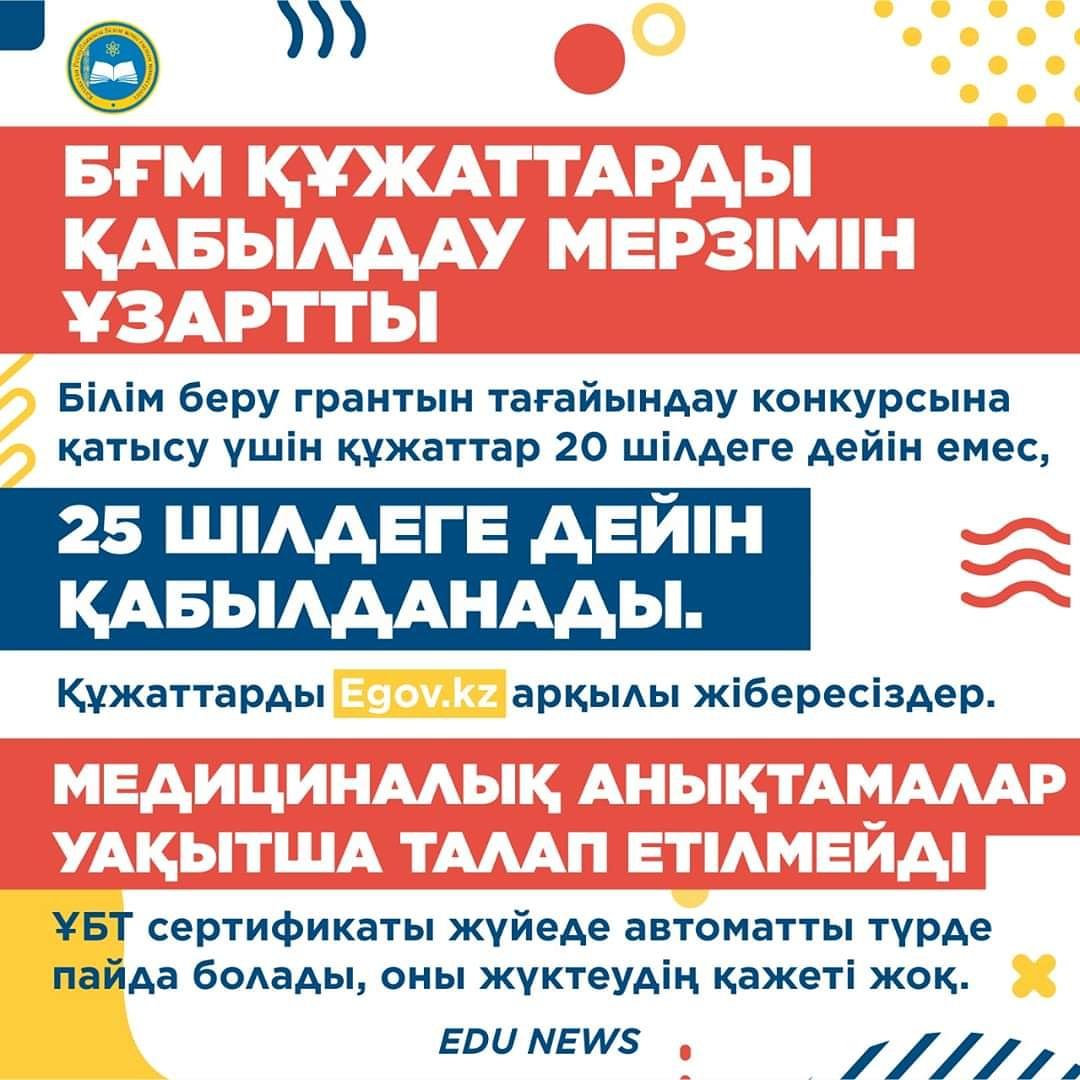 Карантин режимі жағдайында талапкерлерге ыңғайлы болуы үшін БҒМ білім беру грантын тағайындау конкурсына қатысу үшін өтініштерді қабылдау мерзімін ұзартты. Құжаттар 20 шілдеге дейін емес, 25 шілдеге дейін қабыладанады