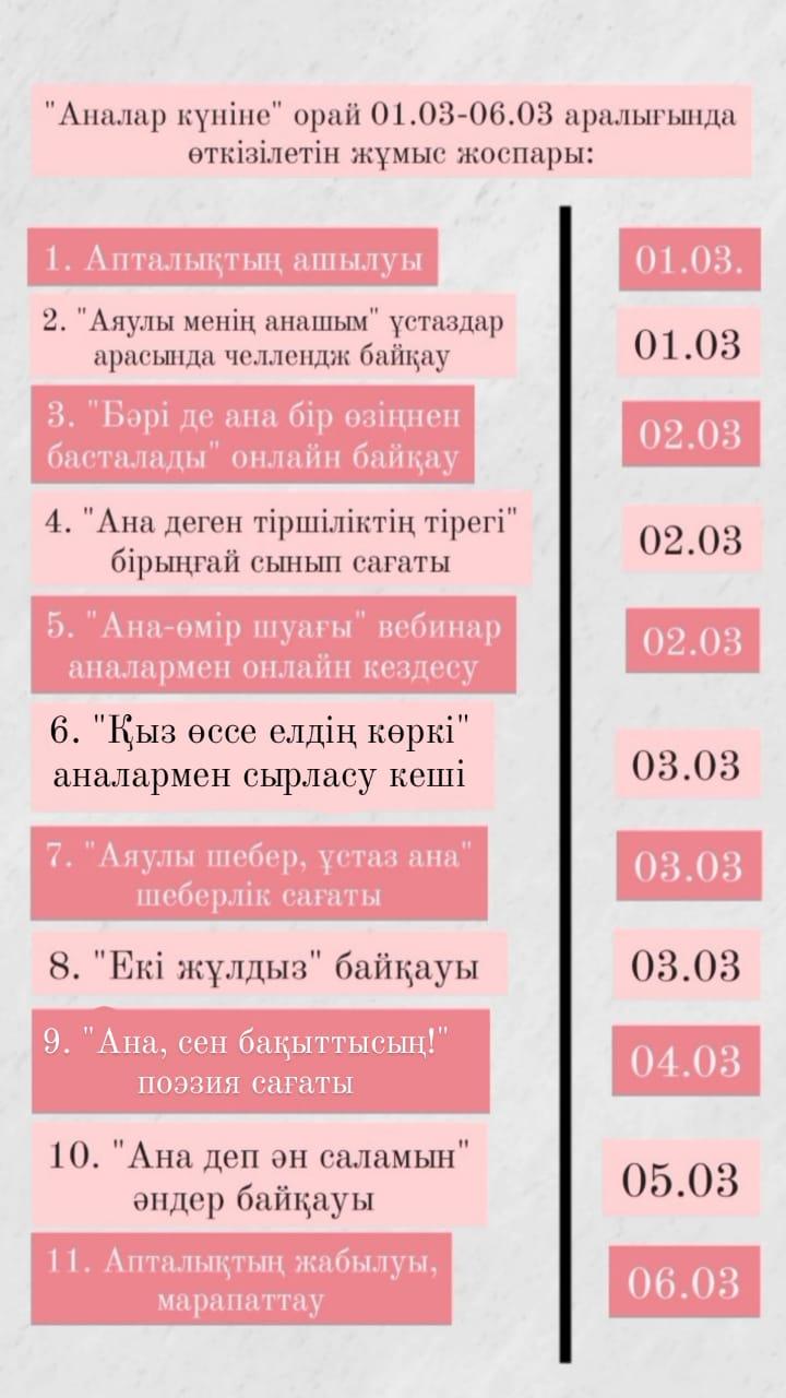 28 февраль 2021 0 1 2 3 4 5 Хабарландыру! Хабарландыру!!!Құрметті ұстаздар, оқушылар және ата-аналар 8-наурыз Халықаралық әйелдер күніне орай "Ана-өмірдің шуағы" атты апталықтың өтетінін хабарлаймыз!!! Апталық жоспары мен танысып, апталыққа белсене қатысыңыздар!!! Осы беттің QR-коды:QR-код этой страницы: