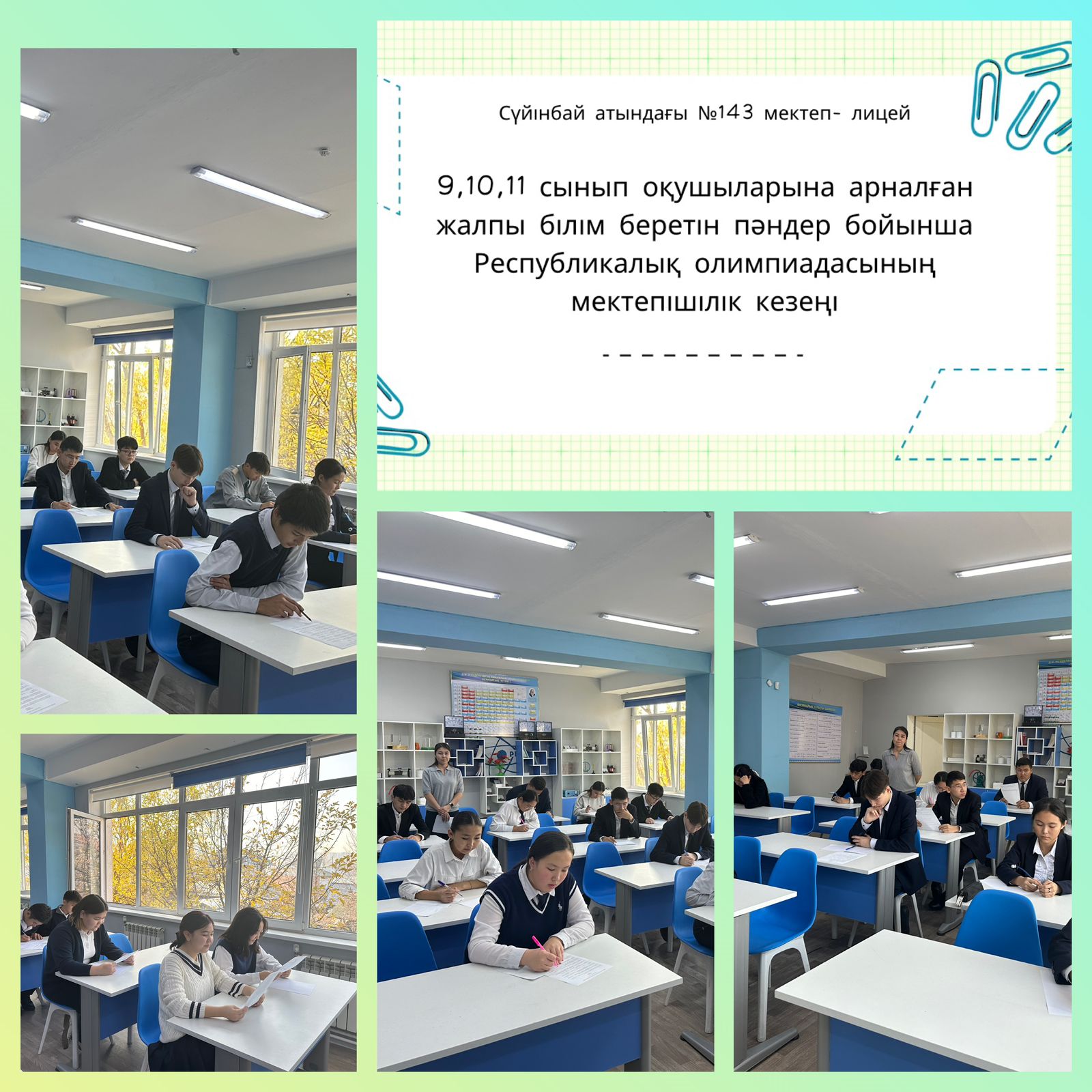 "Алматы қаласы, Білім басқармасының "Алматы дарыны" дарынды балалар мен талантты жастарды анықтау және қолдау жөніндегі орталығы" коммуналдық мекемесінің 2023 жылдың 11 қараша күнгі №445-23, 446-23, 447-23 хатына сәйкес Сүйінбай атындағы №143 мектеп-лицейде 9,10,11 сынып оқушыларына арналған жалпы білім беретін пәндер бойынша Республикалық олимпиадасының мектепішілік кезеңі өткізілді.