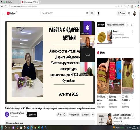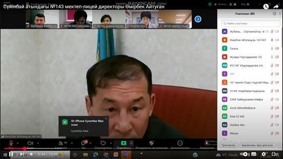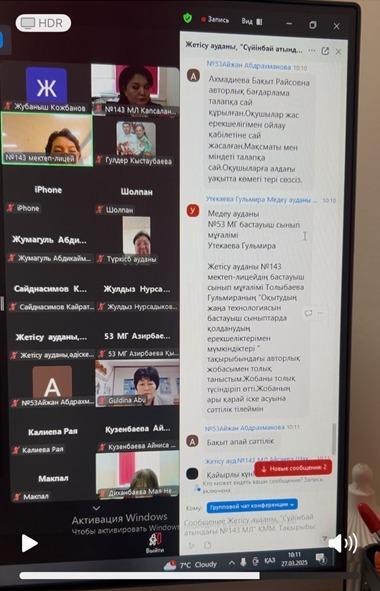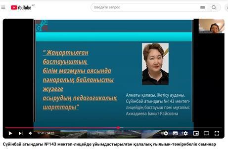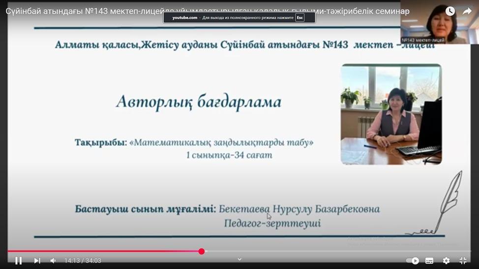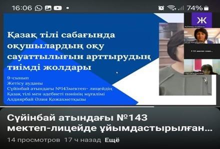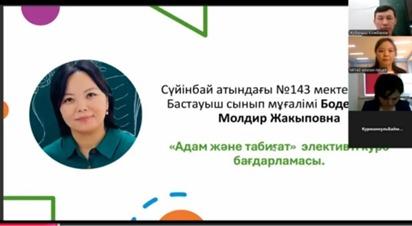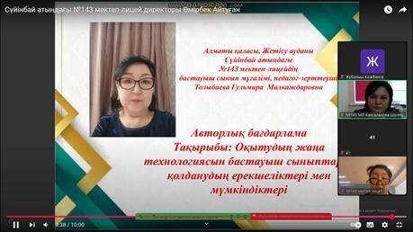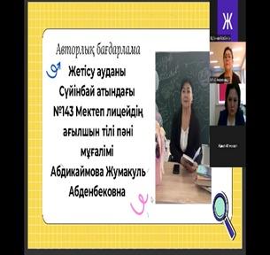 2025 жылдың 8 сәуір күні Алматы қаласы Жетісу ауданы Сүйінбай атындағы №143 мектеп-лицейдің ұйымдастыруымен ZOOM платформасы арқылы « Инновациялық авторлық бағдарламаларды білім беру жүйесіне енгізу: тәжірибе, нәтижелер, болашақ» тақырыбында авторлық бағдарламаларды тәжірибе алмасу мақсатында қалалық семинар өтті. Семинарда Жетісу ауданы білім бөлімінің әдіскері Наймангельдиева Гульшарат Койшыбаевна мен мектеп -лицей директоры Айтуган Омирбек сөз сөйлеп, педагогтарымызға сәттілік тіледі. Семинар барысында педагогтер өздерінің тәжірибесімен еркін бөлісіп, білім беру үдерісіне енгізілген авторлық бағдарламалардың тиімділігі мен нақты нәтижелері ұсынылды. Қатысушылар үшін үлкен шабыт пен мотивация берген, болашақта жаңашыл идеяларды жүзеге асыруға жол ашқан мазмұнды шара болды. Семинарға сондай-ақ Жетісу, Алатау, Медеу, Наурызбай ауданы мектептерінің пән мұғалімдері қатысып, кері байланыстарын берді. Семинар барысында мектебіміздің педагог-зерттеуші мұғалімдері авторлық бағдарламалар туралы тәжірибелерімен бөлісті. Семинарды директордың оқу ісі жөніндегі орынбасары Капсаланова Шолпан Дженисовна жүргізді. Семинар соңында Жетісу, Алатау, Медеу, Наурызбай ауданы қалалық мектептерінің оқу ісі жөніндегі орынбасарлары мен мұғалімдері арасынан бірнеше кері байланысты ауызша және https://padlet.com платформасы арқылы жазбаша пікірлерін қалдырып, семинарға ұсыныстары мен жылы лебіз тілектерін жолдады.