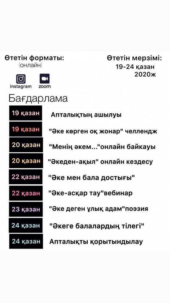 19 октябрь 2020 0 1 2 3 4 5 Хабарландыру!!! Хабарландыру!!! 19-24 қазан аралығында "Әке жолы-ізгі жол" тақырыбында апталықтың ашылуын хабарлаймыз!!! Осы беттің QR-коды:QR-код этой страницы: