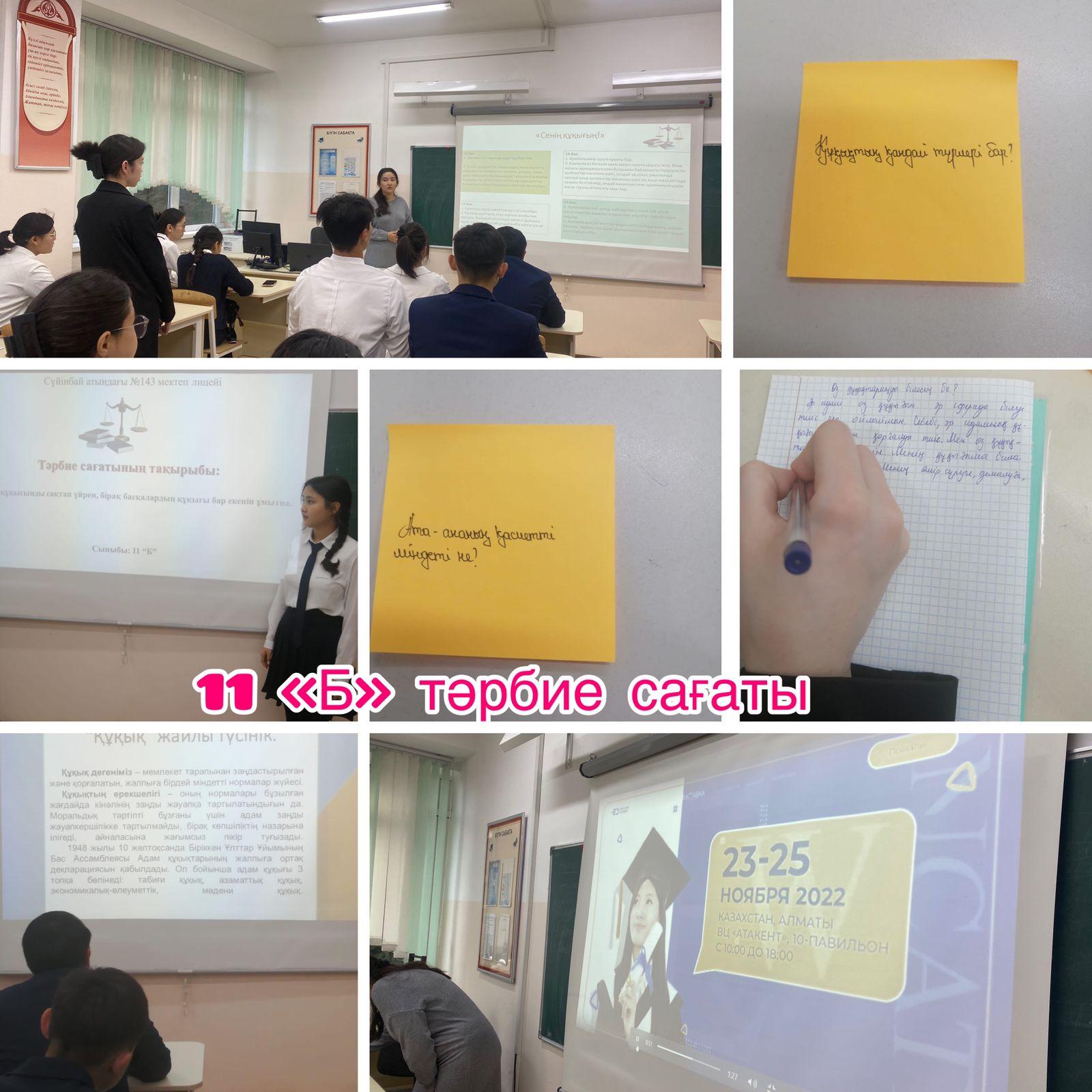 Жетісу ауданы, Сүйінбай атындағы №143 мектеп-лицейдің тәрбие жоспарына сәйкес «Ел жастары» бағдарламасы аясында жалпыға бірдей құқықтық білім беру, құндылыққа негізделген білім мен тәрбие беру мақсатында 11 «Б» сынып оқушылары арасында «Құқықтық сауаттылық-заман талабы» тақырыбында тәрбие сағаты болып өтті. Сынып жетекшісі Сейілбекова Гульбақша Қуаныштайқызы