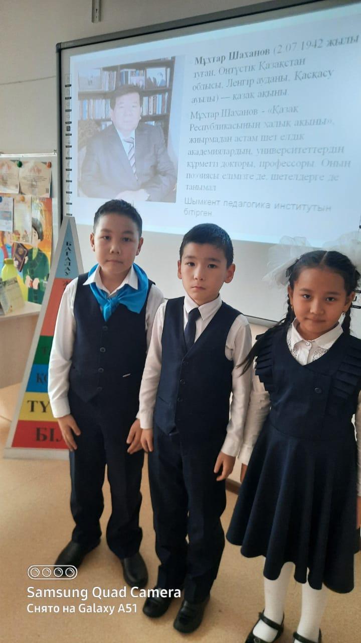 Жетісу ауданы, Сүйінбай атындағы №143 мектеп-лицейдің «Қазіргі мектептерде саналы ұрпақ тәжірбиесін жетілдіру» тұжырымдамасы негізінде «Оқуға құштар мектеп» жобасы аясында 3 «А» сынып оқушылары арасында Мұхтар Шахановтың 80 жыл толуына орай жазушының өмірі мен шығармашылығын кеңінен насихаттау мақсатында «Мұхтар Шаханов- заманының заңғар тұлғасы» тақырыбында тәрбие сағаты өтті. Сынып жетекшісі Ахмадиева Бақыт