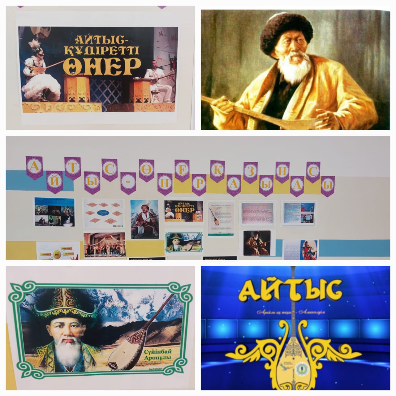 1-ТОҚСАН АҚЫНДАР АЙТЫСЫ бағыты бойынша «Айтыс-өнер қазынасы» тақырыбында ұлттық құндылығымыз айтыс өнерін кеңінен насихаттау мақсатында көрме ұйымдастырылды. Ұйымдастырушы қазақ тілі мен әдебиеті пән мұғалімі Бақытжан Назгүл Дәуренқызы
