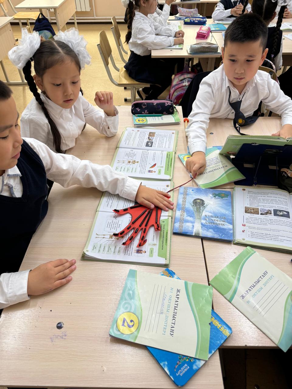 Сабақ барысында оқушыларға қозғалыс кезінде бұлшық еттердің қалай жиырылатынын, жуандап, қысқаратынын тәжірибе жасай отырып түсіндірді.