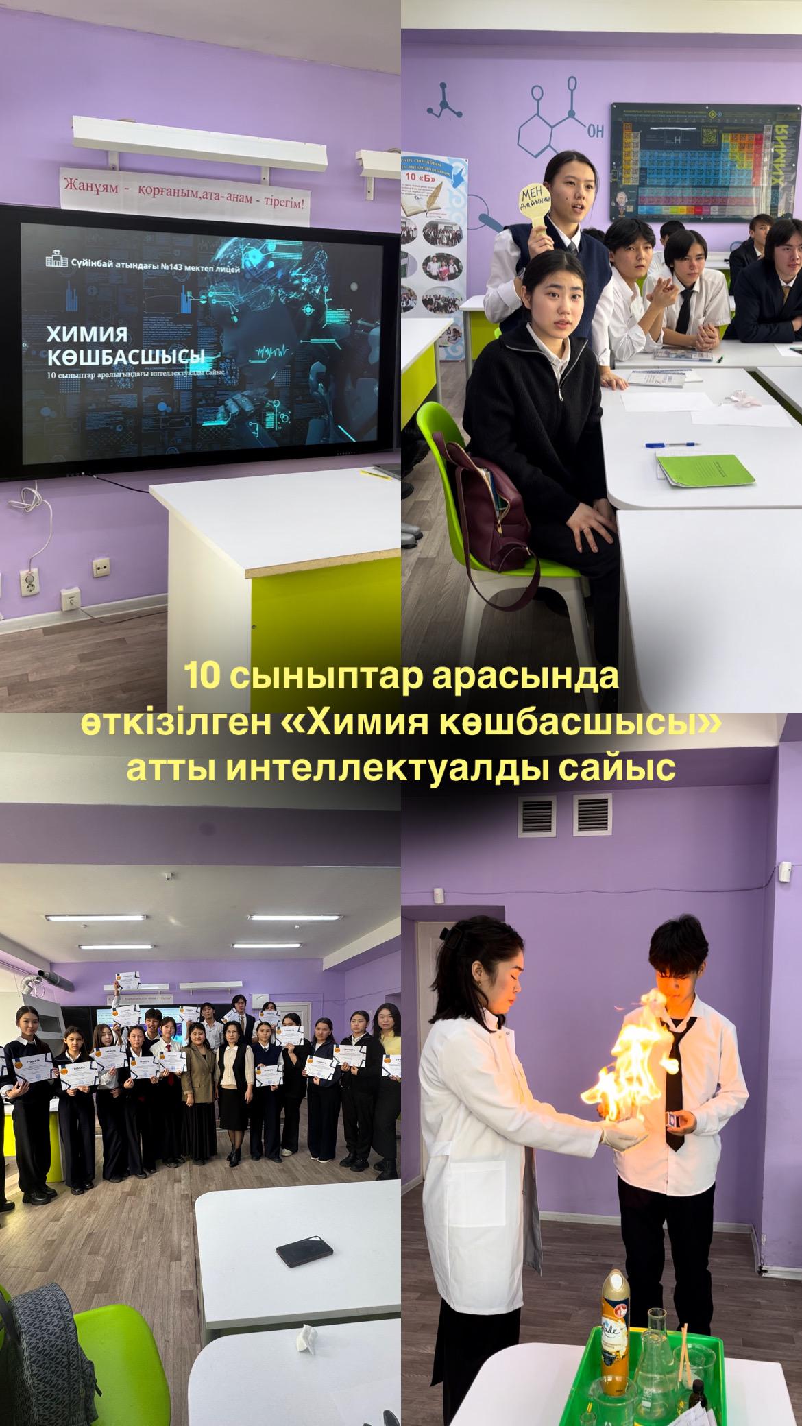 Сүйінбай атындағы №143 мектеп-лицейінде 10-сынып оқушылары арасында химия пәнінен «Химия көшбасшысы» атты зияткерлік сайыс өтілді. Іс-шараны Абай атындағы Қазақ ұлттық педагогикалық университетінің практиканттары және химия пәнінің мұғалімі Турганбаева Жанат Абдуллаевна ұйымдастырды.