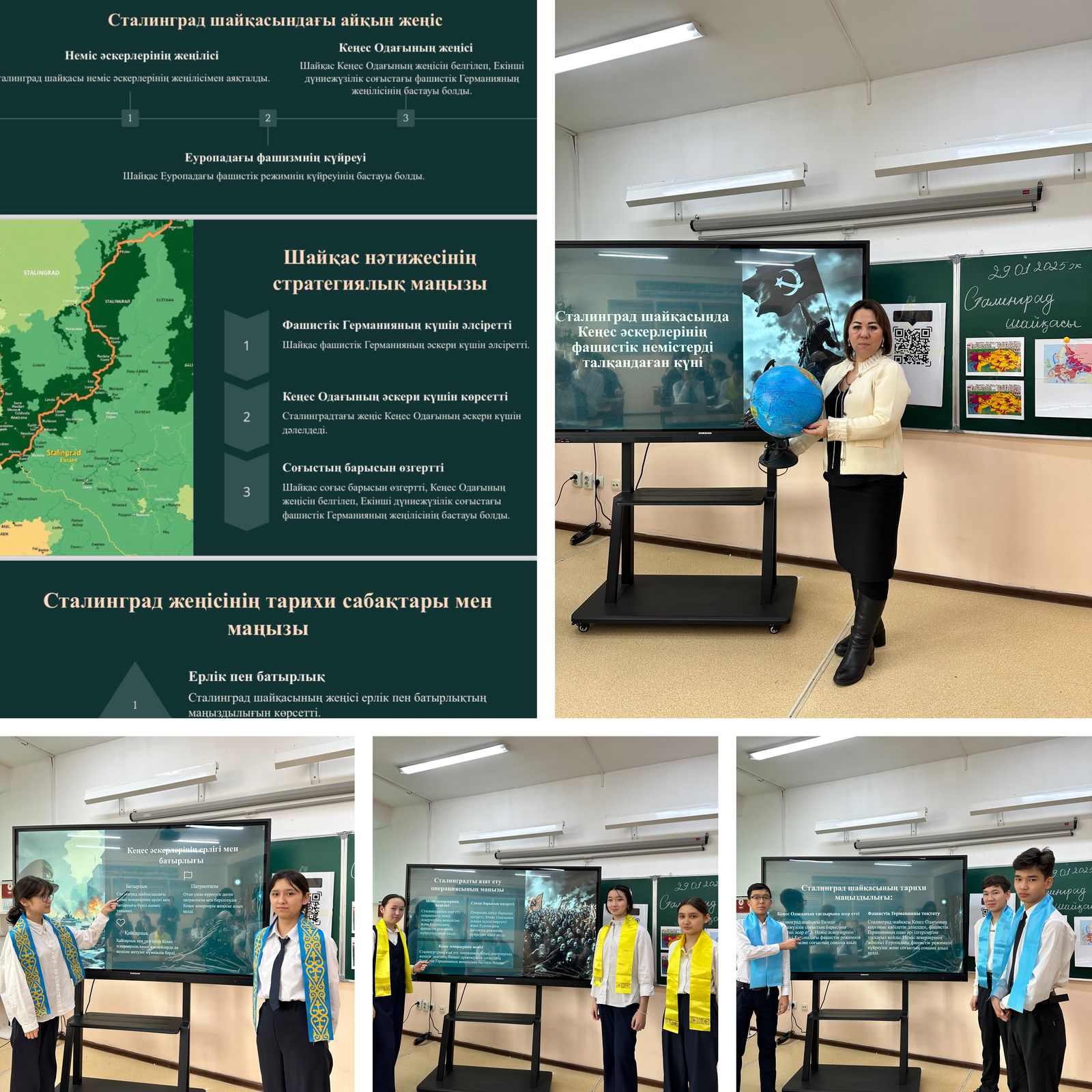 Алматы қаласы, Жетісу ауданы, Сүйінбай атындағы №143 мектеп лицейінде, тарих пәнінің мұғалімі Каймолдина Лаура Бакытжаровна Ұлы Отан Соғысының 80 жылдығына орай " Сталинград шайқасында Кеңес әскерлерінің фашистік немістерді талқандаған күні" тақырыбында танымдық сабақ өткізді