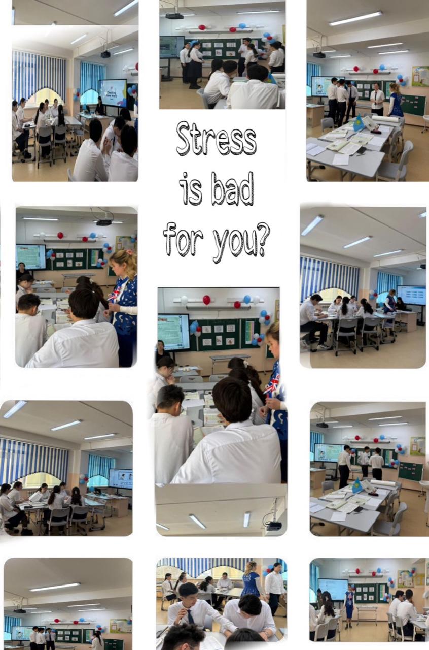 Сүйінбай атындағы 143 мектеп-лицейдің ағылшын тілі пәнінен мұғалімі Джамбулова Ж.Е. 10 “Ә”сыныбымен ашық сабағың өтті. Тақырыбы: Stress is bad for you?” Сабақтың мақсаты: