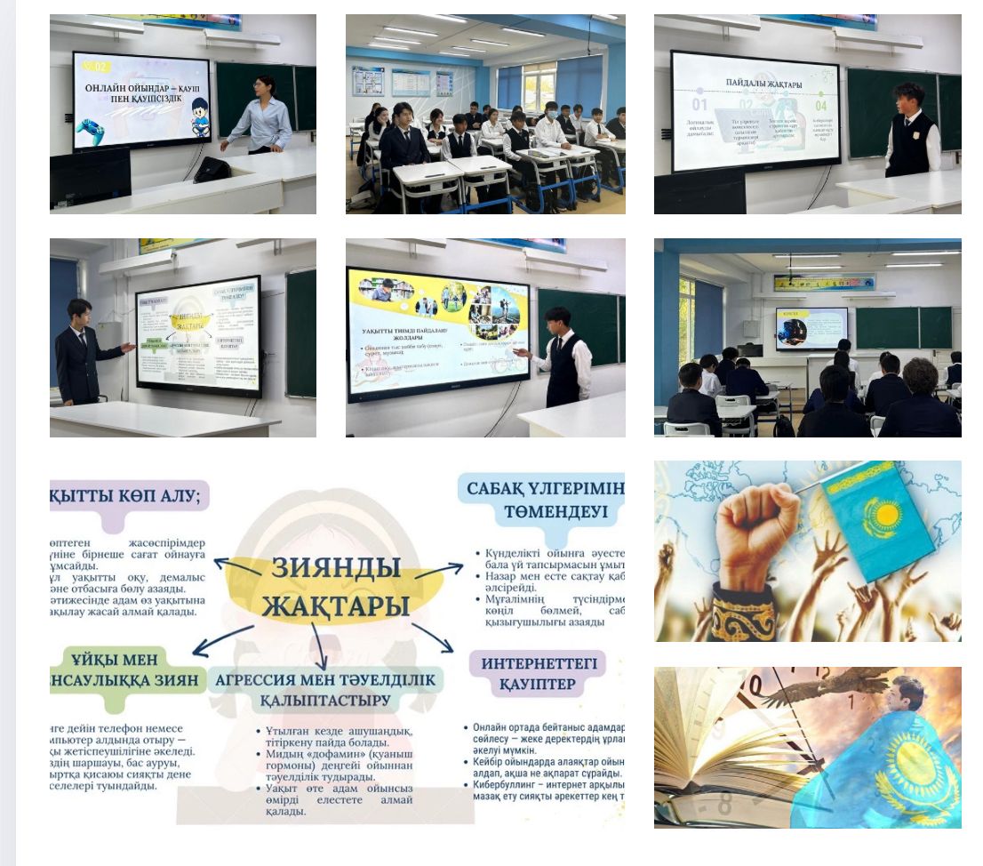 Сабақ барысында оқушыларға онлайн ойындардың оң және теріс жақтары жайлы ақпарат берілді. Сынып жетекшілері оқушыларға мынадай маңызды аспектілерді түсіндірді: