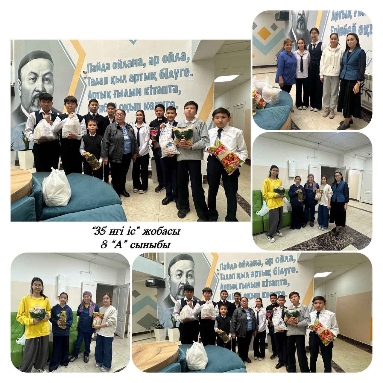 Сүйінбай атындағы №143 мектеп-лицейдің 8”А” сынып оқушылары Республика күніне орай “35 игі іс” жобасы аясында мектебіміздің кіші қызметкерлері қарт кісілерге сый-сияпаттарын ұсынып, ізгі лебіздерін білдірді. Қарттарға көмек — әрбір адамның адамгершілік борышы. Қарттар — біздің өткеніміздің, куәсі, өмірлік тәжірибенің, даналықтың иелері. Оларға қамқорлық, жасау - ата-анамызға, болашақтағы