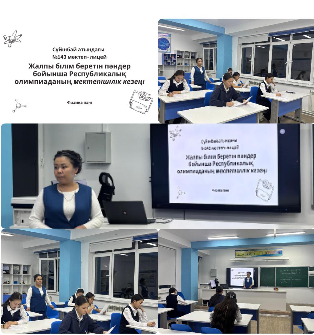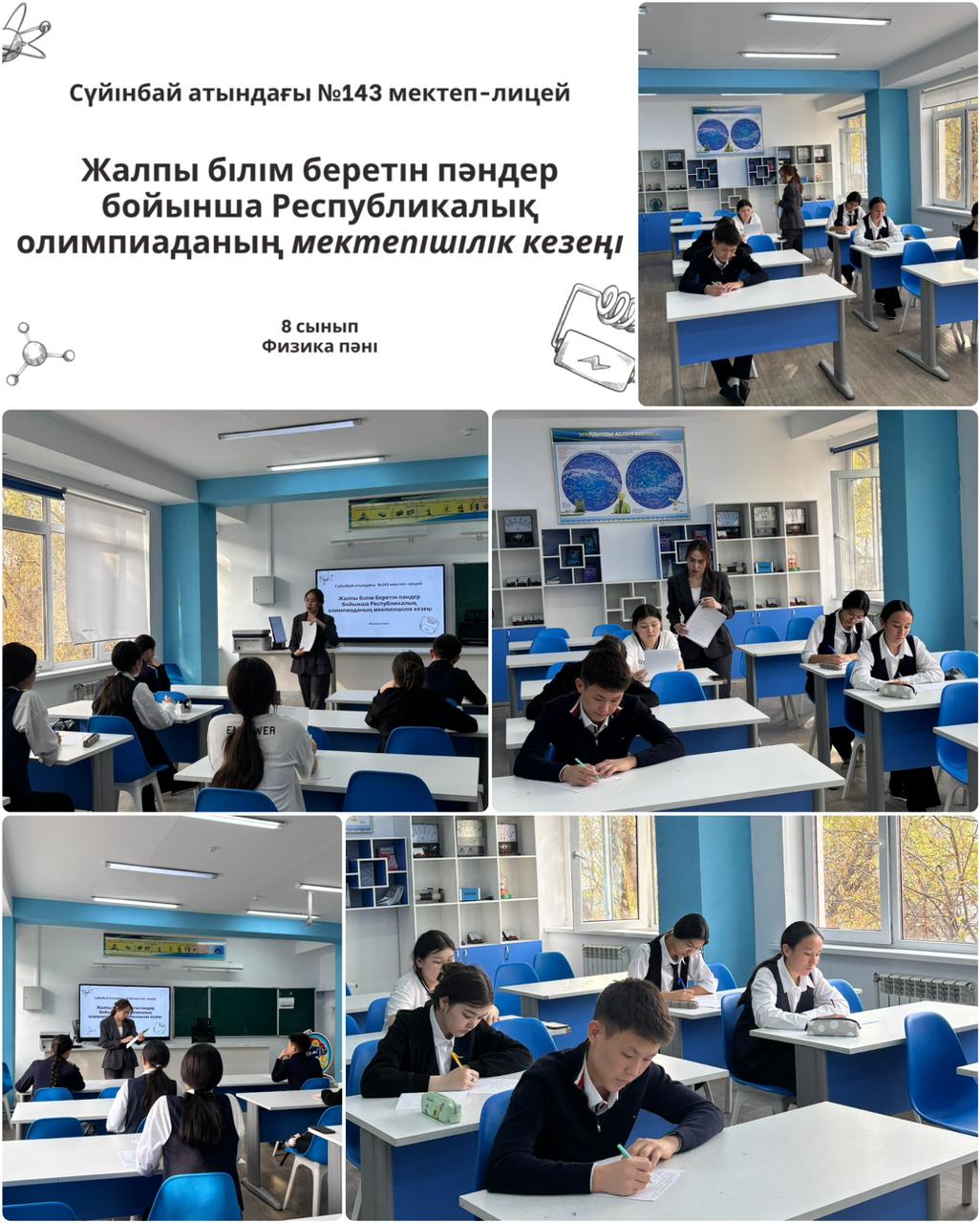 Сүйінбай атындағы №143 мектеп-лицейінде 7–8 сынып оқушылары арасында физика, информатика пәндерінен Республикалық пәндік олимпиаданың мектепішілік кезеңі өткізілді. Олимпиадаға оқу озаттары, логикалық ойлау қабілеті жоғары, пәнге қызығушылығы бар оқушылар қатысып, өз білімдерін сынға салды.