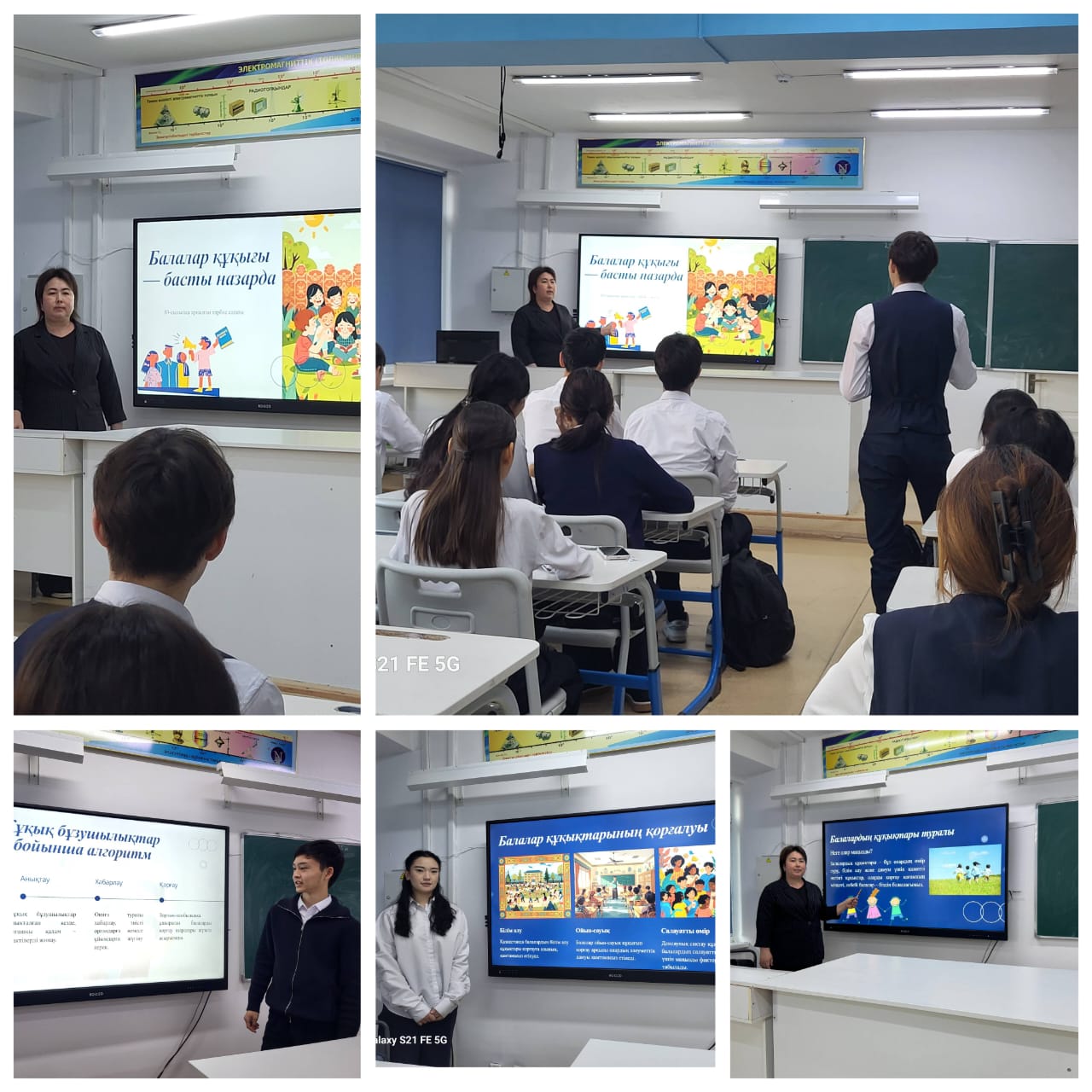 Сүйінбай атындағы №143 мектеп-лицейдің 10"Б" сыныбында мектепшілік жоспарға сәйкес «Балалар құқығы – басты назарда» тақырыбында тәрбие сағаты өткізілді. Сабақтың мақсаты – оқушыларға Бала құқықтары туралы Конвенциядағы негізгі баптарды таныстыру, өз құқықтары мен жауапкершіліктерін түсіндіру, құқықтық мәдениетті қалыптастыру болды. Іс-шара барысында оқушылар балалардың негізгі құқықтары, оларды қорғау жолдары туралы ой бөлісіп, түрлі жағдаяттарды талдады. Сабақ оқушылардың құқықтық сауаттылығын арттыруға және өз құқықтарын құрметтеп, қорғай білуге бағытталды.
