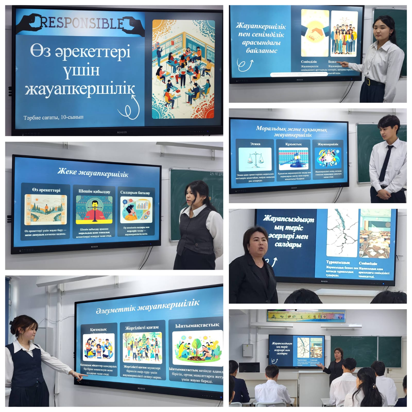 Сүйінбай атындағы №143 мектеп-лицейінде 10Б сыныбында «Өз әрекеттері үшін жауапкершілік» тақырыбында тәрбие сабағы ұйымдастырылды. Сабақтың мақсаты – оқушыларға жауапкершілік ұғымын түсіндіру, қабылдаған шешімдердің салдарын бағалау, өз әрекетіне жауап бере алатын тұлға қалыптастыру.