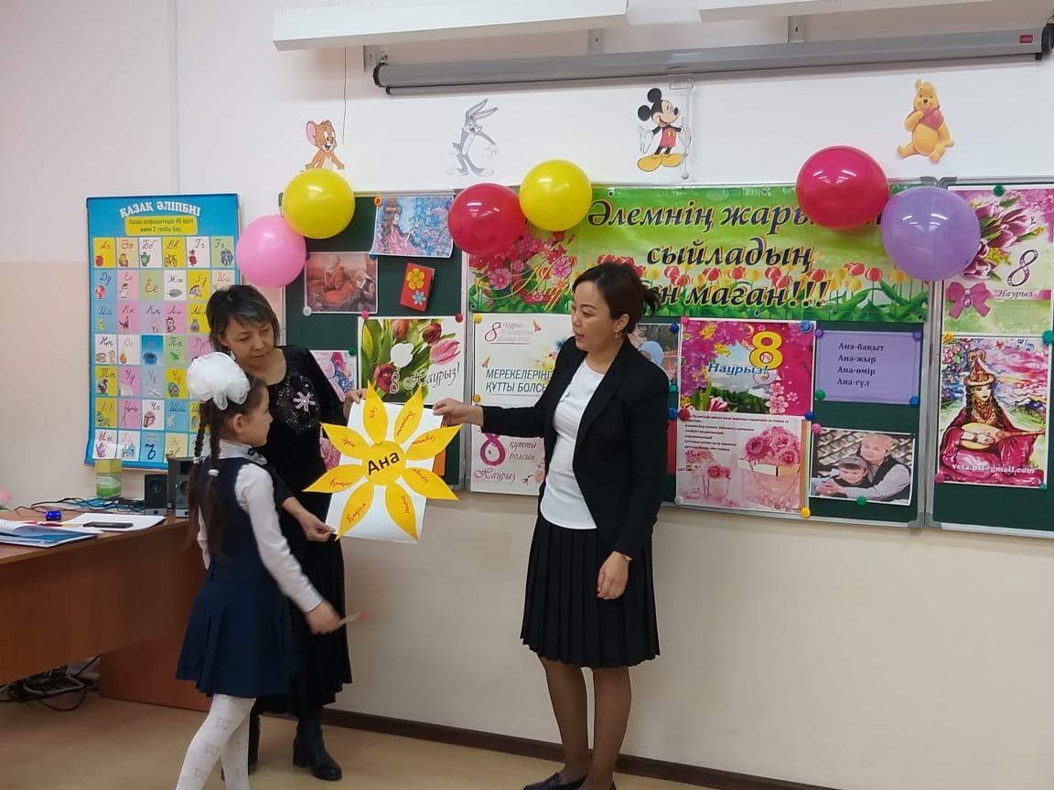 Сүйінбай атындағы 143 мектеп-лицейдің 1"Б"сынып оқушысының ата-анасы:Мыктыбекова Айнур 8- наурыз халықаралық аналар күніне орай "Əлемнің жарығын сыйладың сен маған!" деген тақырыпта тəрбие сағатын өткізді. Мақсаты: Балаларға 8- наурыз туралы түсінік беру. Жанұядағы ана мен бала арасындағы қарым-қатынасты нығайту. Анаға деген бала махаббатын ояту. Балаларды мейірімділікке,аналардың өлшеусіз еңбегін бағалай білуге тəрбиелеу.