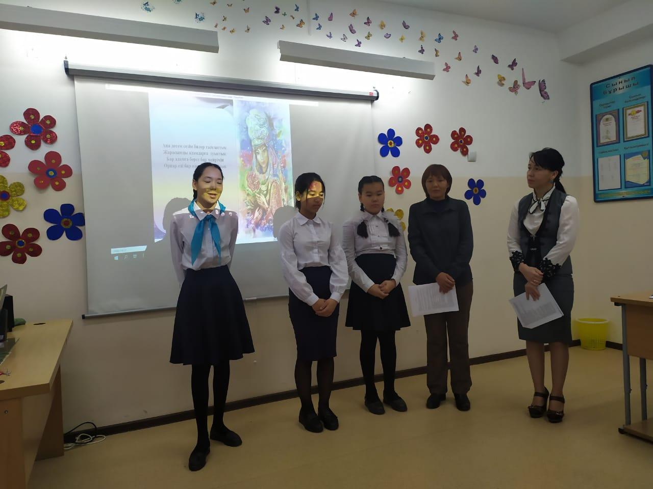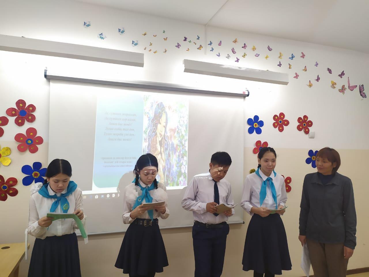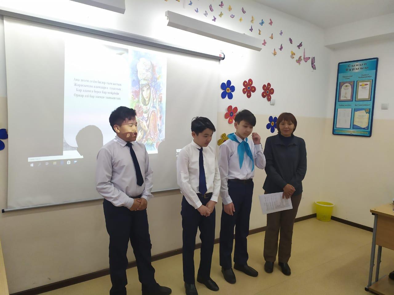Сүйінбай атындағы №143мектеп-лицейдің 7г сынып оқушысы Балкен Аружанның анасы Узенбаева Жұпар сынып оқушыларымен "Ана- өмір шуағы" тақырыбында тәрбие сағатын өткізді. Мақсаты: оқушыларды анаға деген сүйіспеншілікке баулу ана еңбегін бағалап, мейірімділікке, сый-құрметке тәрбиелеу.