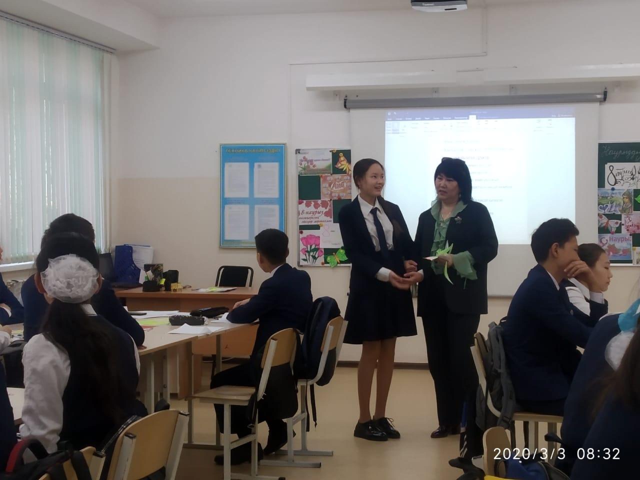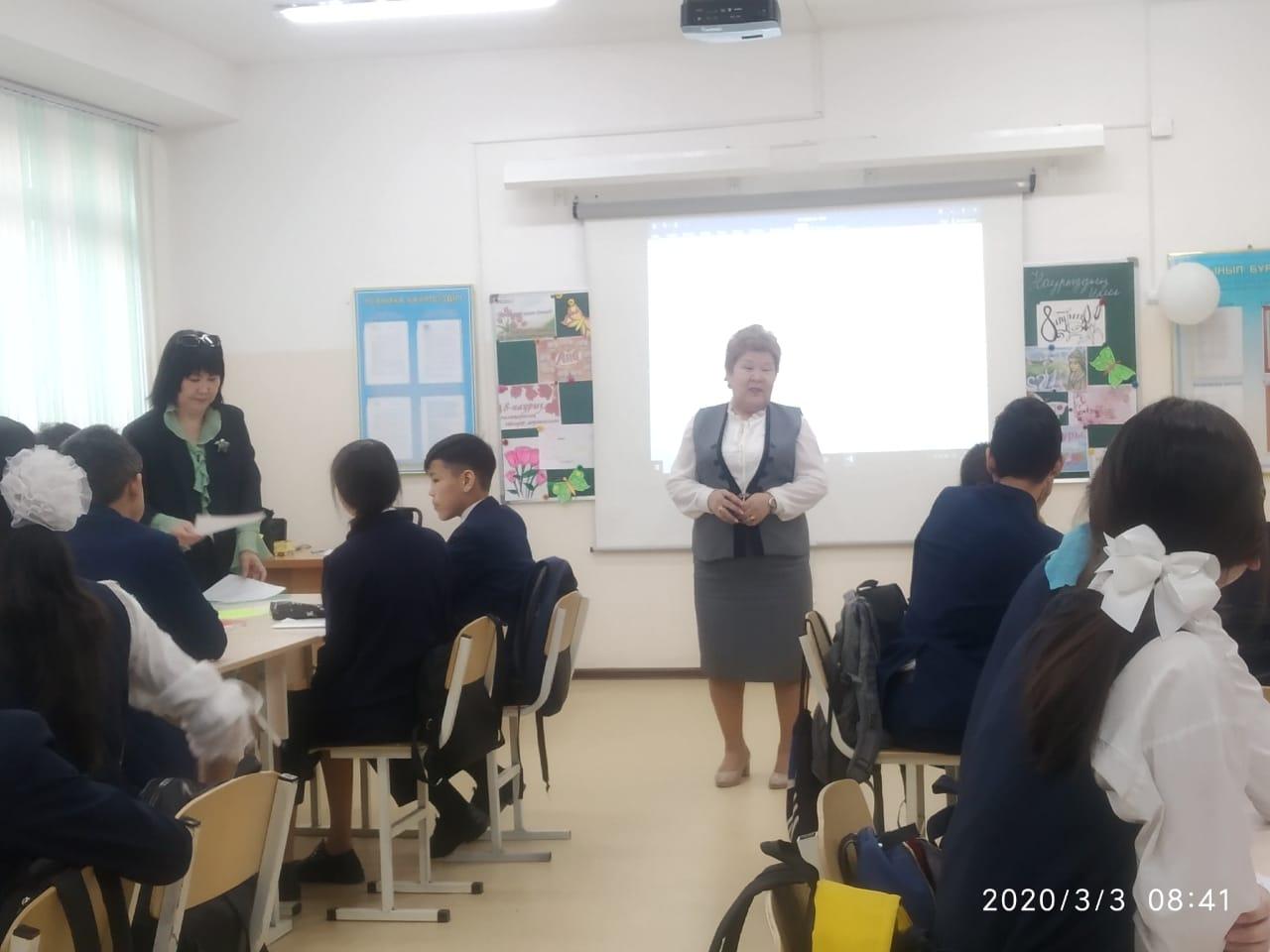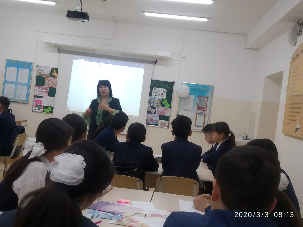 Сүйінбай атындағы №143мектеп-лицейде 8"В" сынып жетекшісі С.Сраймова мен оқушысы Аубакирова Аружанның анасы Аубакирова Жанаргуль "Ана-өмірдің шуағы" тақырыбында тәрбие сағатын өткізді. Мақсаты: Оқушыларға ана туралы ананың өмірде алатын ерекше орны туралы мағлұмат беру.
