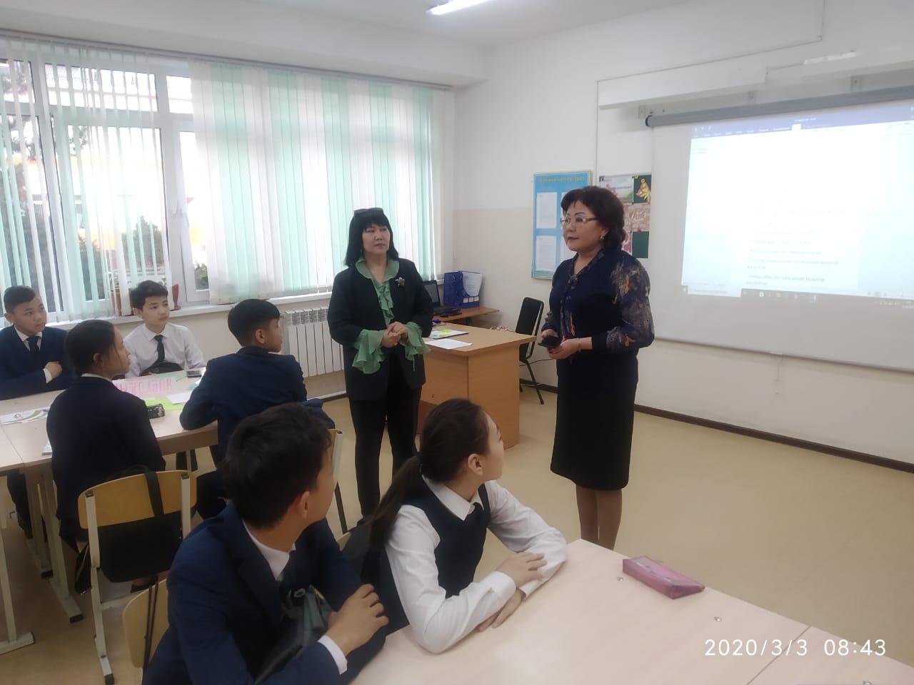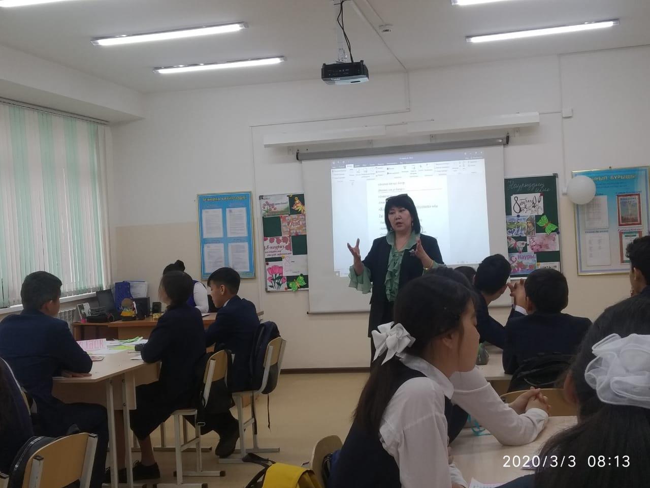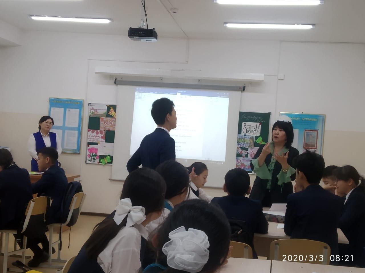 Сүйінбай атындағы №143мектеп-лицейде 8"В" сынып жетекшісі С.Сраймова мен оқушысы Аубакирова Аружанның анасы Аубакирова Жанаргуль "Ана-өмірдің шуағы" тақырыбында тәрбие сағатын өткізді. Мақсаты: Оқушыларға ана туралы ананың өмірде алатын ерекше орны туралы мағлұмат беру.