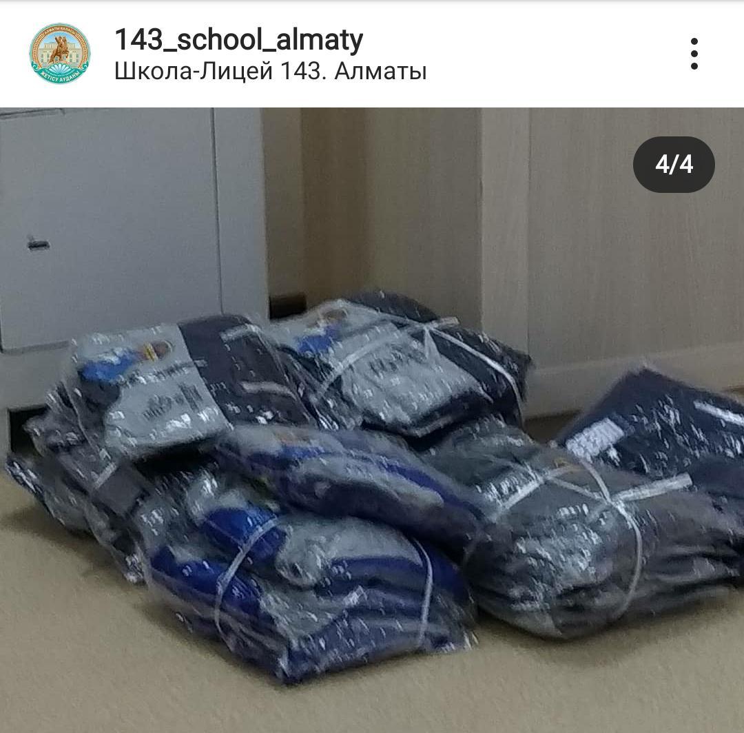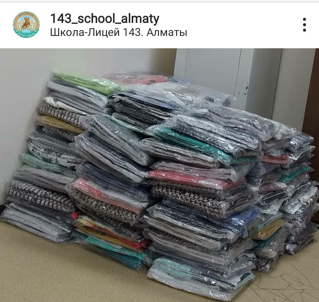 Жетісу ауданы Сүйінбай атындағы №143 мектеп-лицейі Алматы қаласы бойынша Экономикалық тергеу Департаменті ұсынған көмекті қабылдап, көп балалы, әлеуметтік аз қамтылған отбасыларды осы киімдермен қамтамасыз етуде.