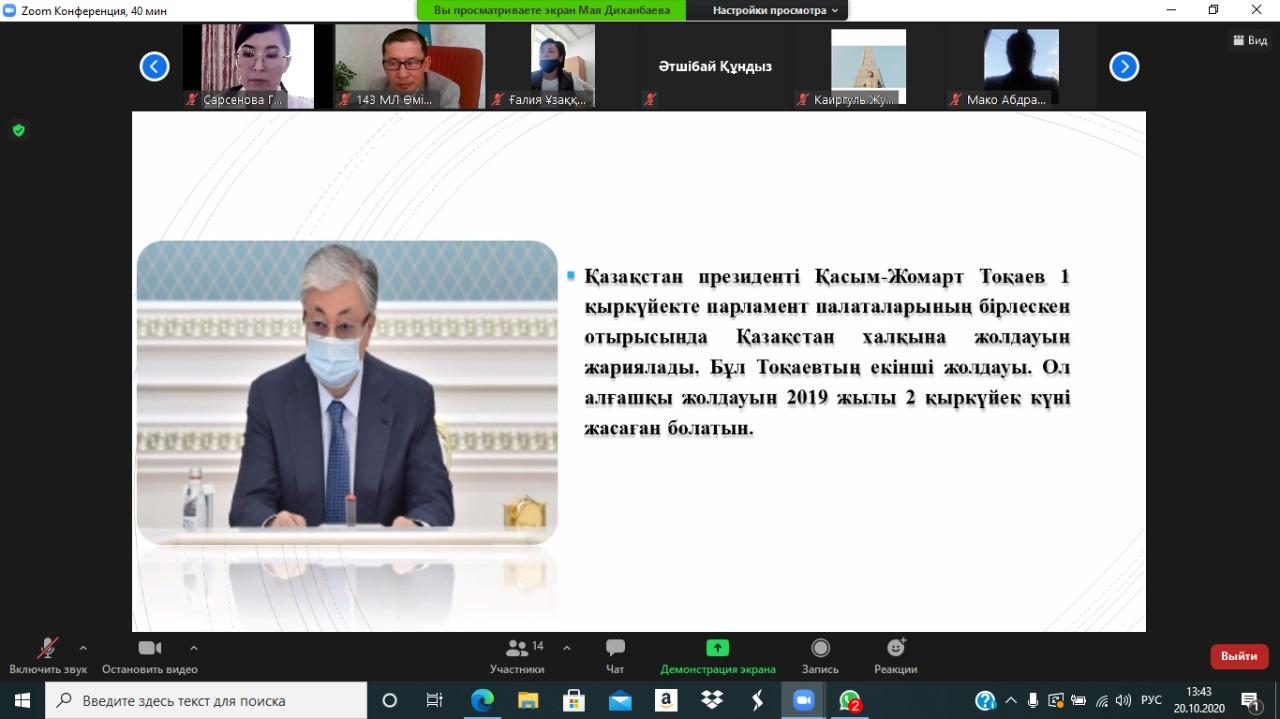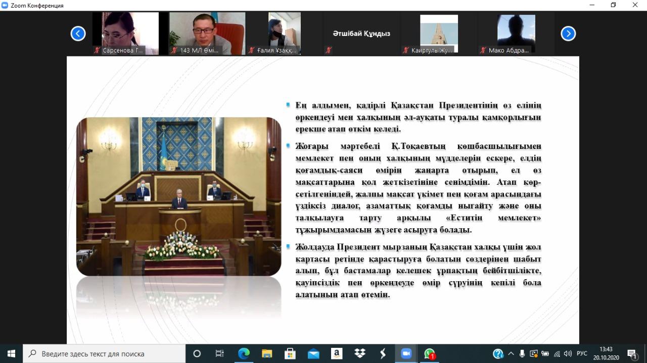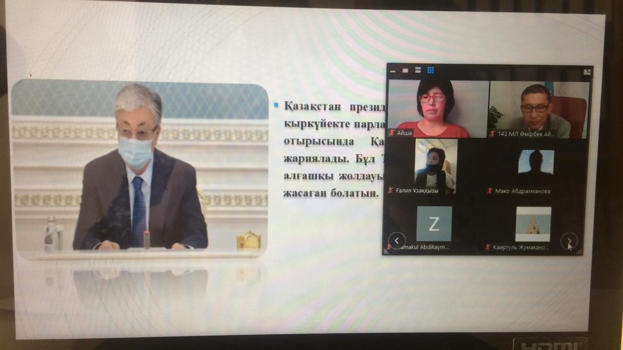 Жетісу аудандық білім бөлімінің жоспарына сәйкес Сүйінбай атындағы № 143 мектеп-лицейдің тарих пәні мұғалімдерінің ұйымдастыруымен ҚР Президентінің 2020 жылғы 1 қыркүйектегі " Жаңа жағдайдағы Қазақстан:іс-қимыл кезеңі" жолдауына талдау онлайн форматта өтті.Бірлестік жетекшілері мен пән мұғалімдері қатысып, ой- пікір өрбітті.