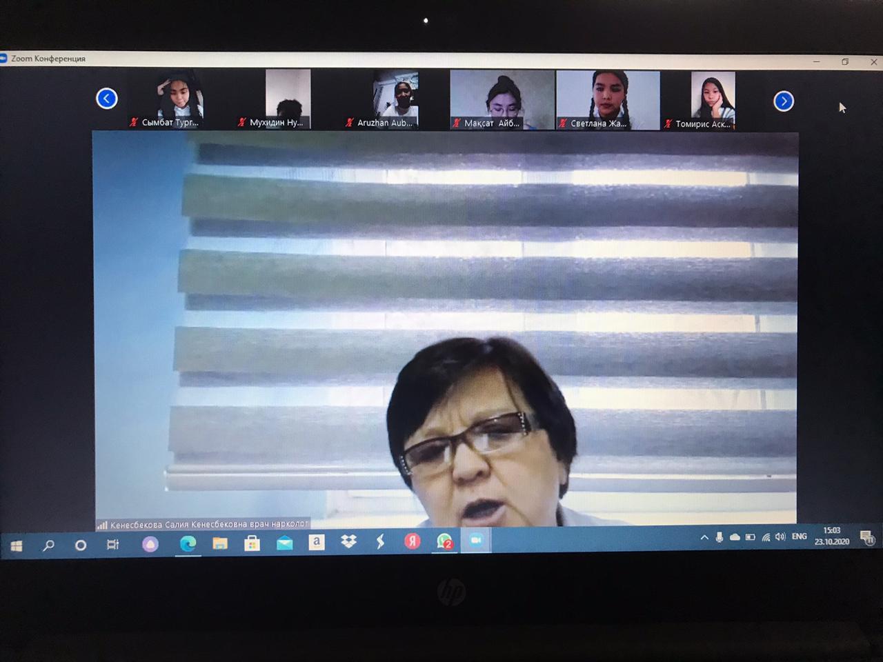 Жетісу ауданының білім бөлімінің тапсырысы бойынша Сүйінбай атындағы #143 мектеп-лицейінде 23 қазан күні 9-10 сынып оқушыларымен салауатты өмір салтын қалыптастыру, зиянды заттардан аулақ болуға шақыру мақсатында психиатр нарколог Салия Кенесбековнамен "Есірткінің зияны туралы" тақырыбында онлайн лекция өткізді