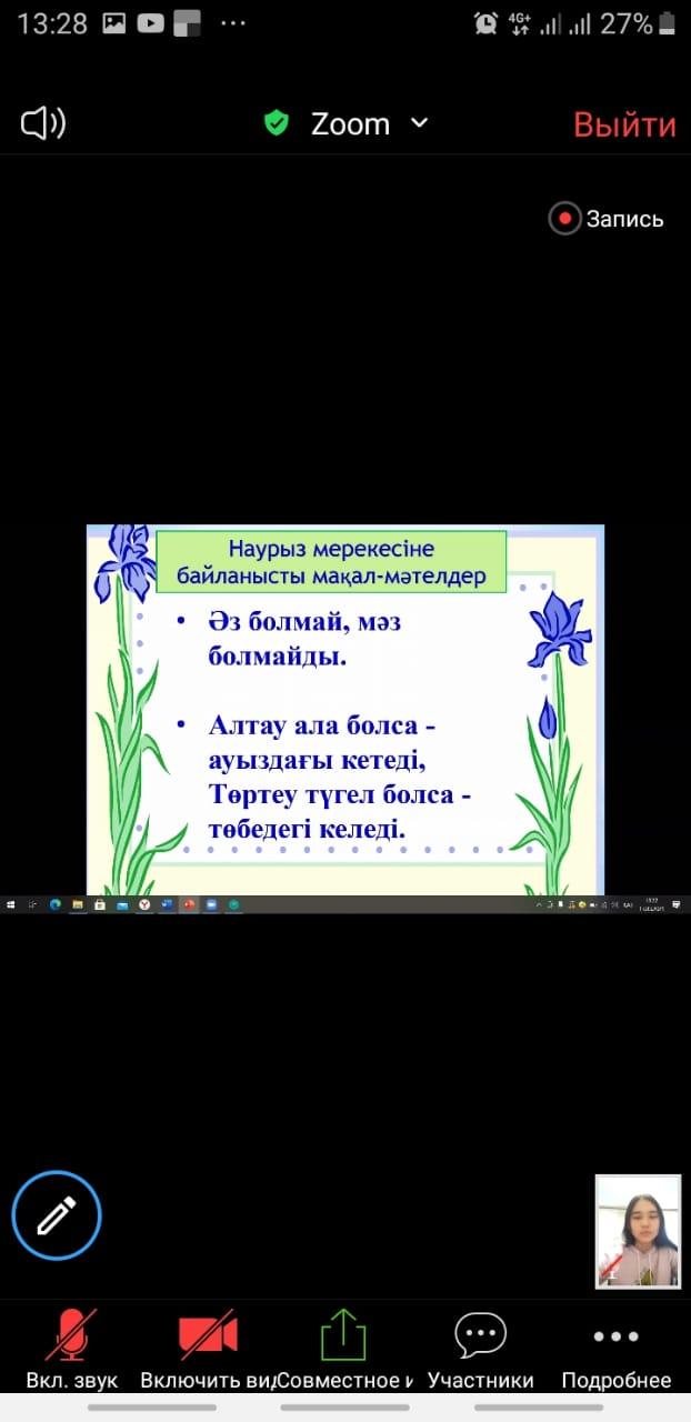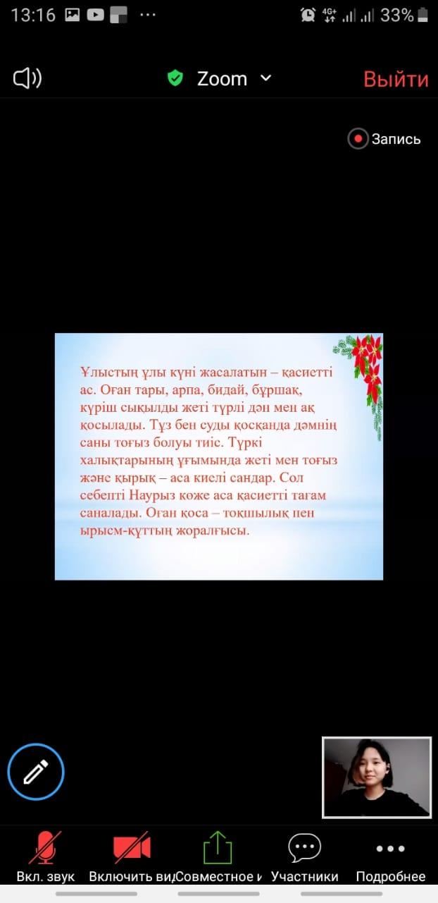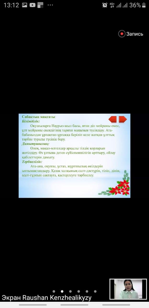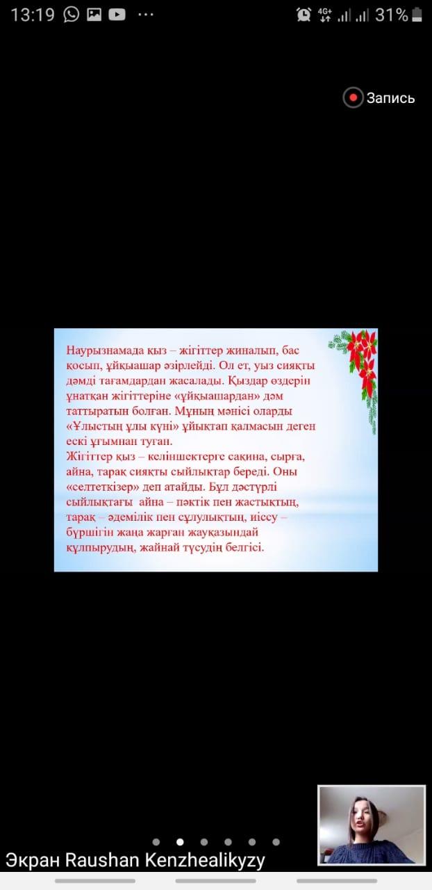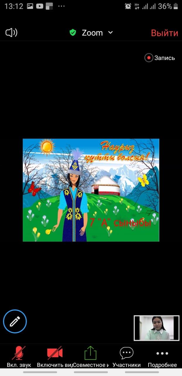 18 март 2021 0 1 2 3 4 5 Ұлыстың ұлы күні-Наурыз Ұлыстың ұлы күні Наурыз мерекесін мерекелеу қарсаңында 7 А сынып оқушылары мен "Қош келдің әз Наурыз" тақырыбында сынып сағаты болып өтті. Сынып жетекшісі Джамбулова Жамал Осы беттің QR-коды:QR-код этой страницы: