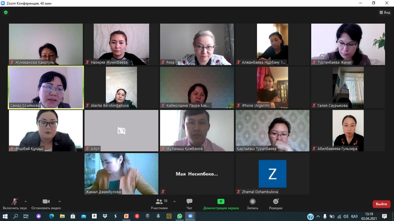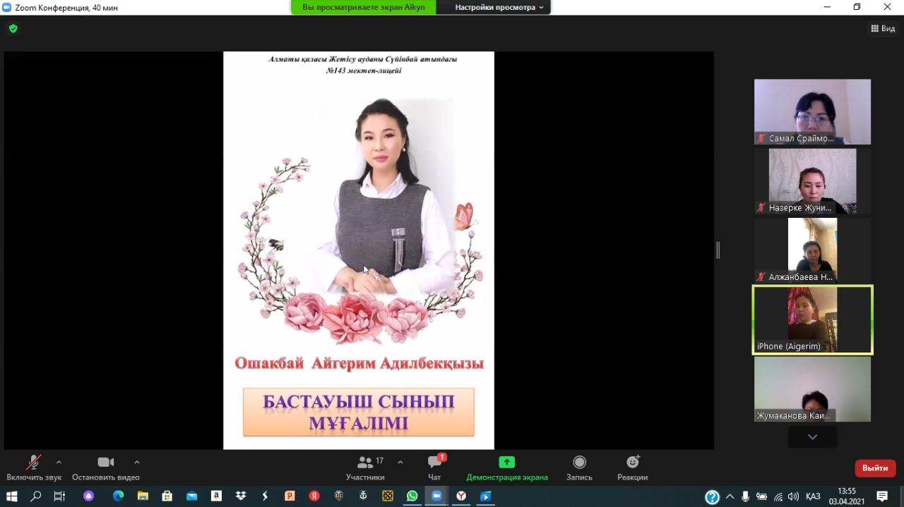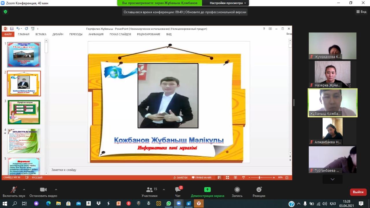 Мектепішілік байқауға 7 мұғалім қатысып жатыр, Әтшібай Құндыз Ақылсерікқызы, Қанатұлы Жеңіс, Сраймова Самал Сагатовна, Қожбанов Жұбаныш Мәлікұлы, Турганбаева Жанат Абдуллаевна, Ошақбай Айгерим Адилбекқызы, Джамбулова Жамал Ержумаевна 03.04.2021 күні байқаудың 1 кезеңі өтті.