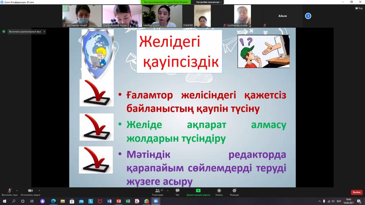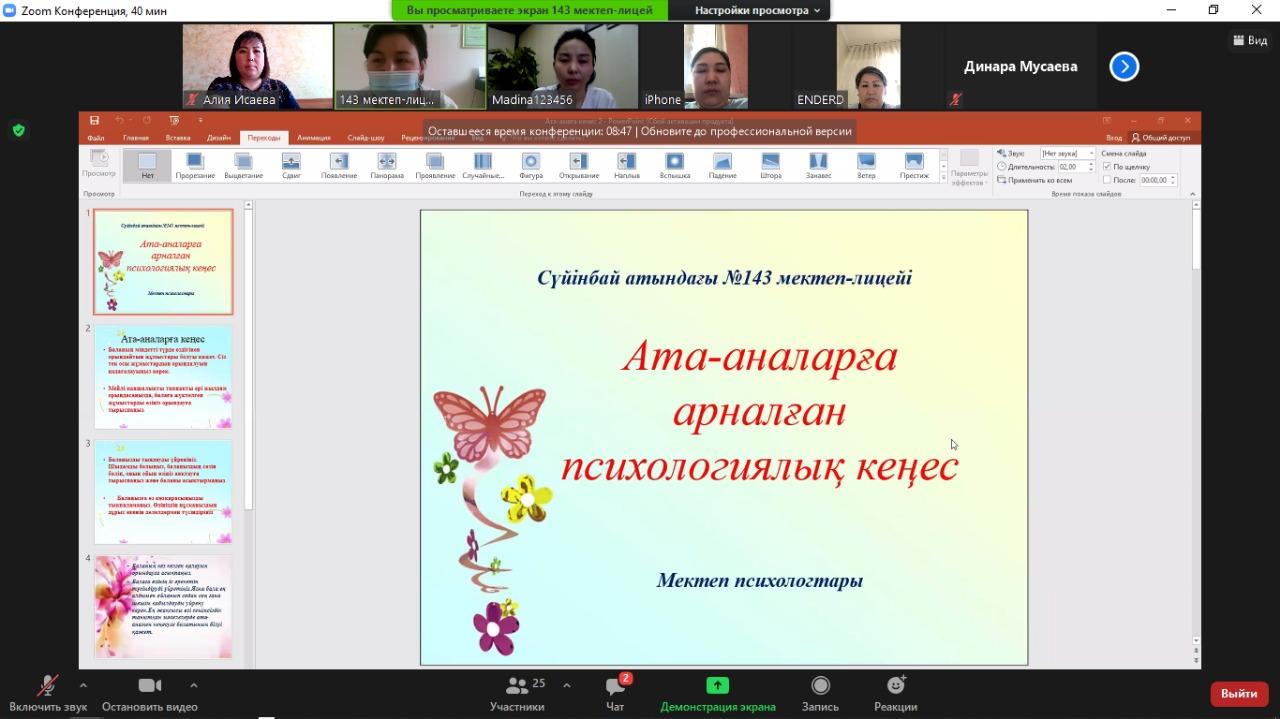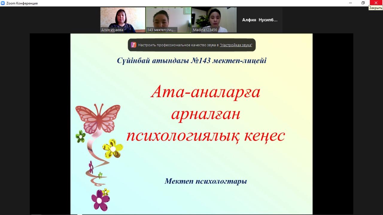 Сүйінбай атындағы №143 мектеп-лицейде 2021 жылғы 10сәуір сағ. 10.30-да мектеп-лицей әкімшілігі қашықтық оқыту жағдайында балаларды тәрбиелеу мәселелерінде, "Мектеп-лицей – Бала – Ата-ана" қарым-қатынасы мен өзара ықпалдасуына қатысты психологиялық- педагогикалық қолдау бойынша барлық толғандыратын мәселелерде ата-аналарға пәрменді көмек көрсету мақсатында "Директорлық сенбі – ата-ана үні" онлайн-кездесуін өткізді.