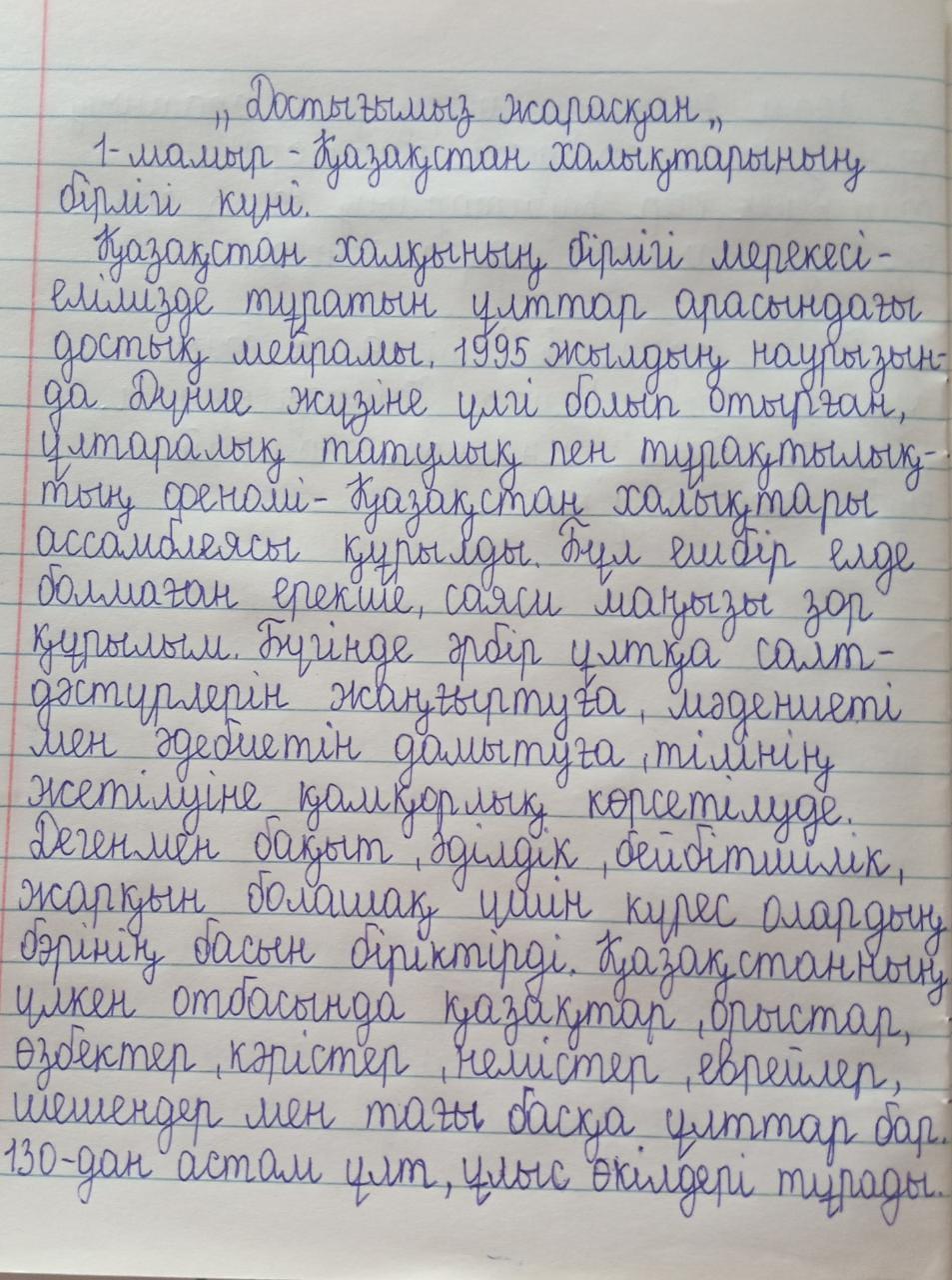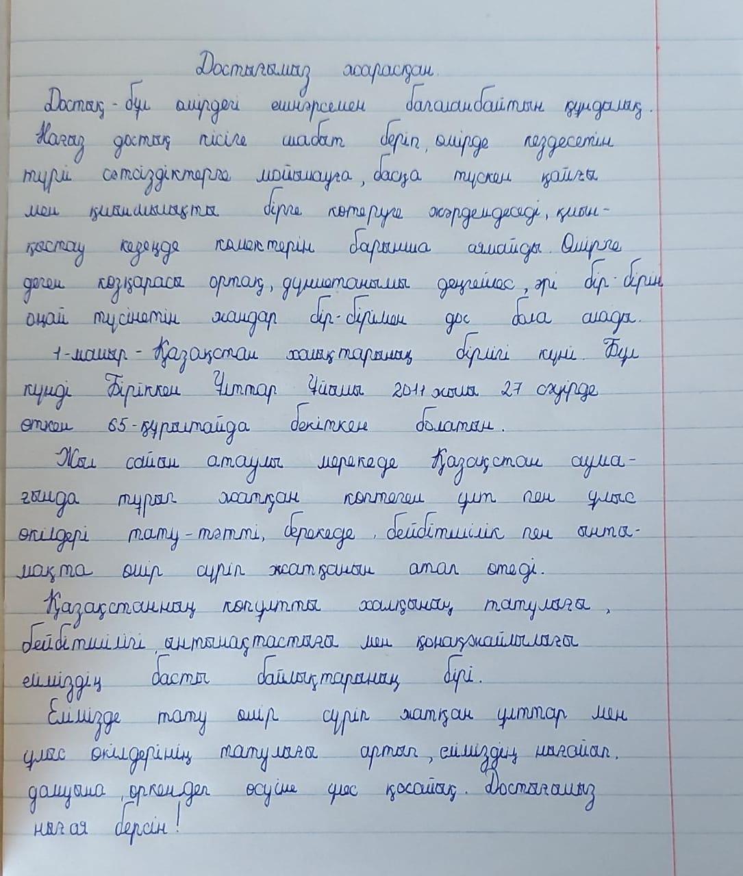 «1 Мамыр-Қазақстан халықтарының бірлігі» күніне орай, мектеп оқушылары "Достығымыз жарасқан" атты тақырыпта шығарма жазды.