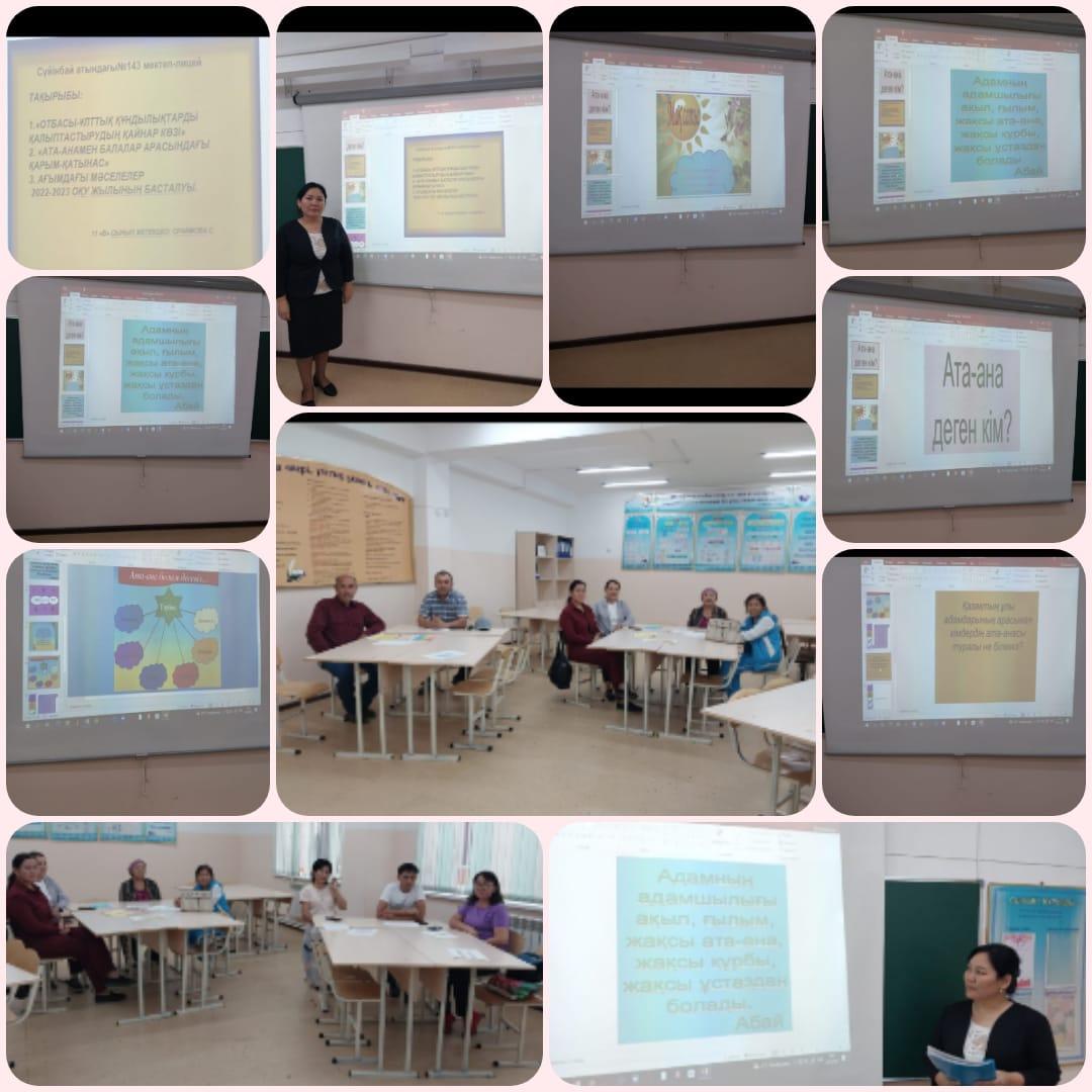 24 сентябрь 2022 0 1 2 3 4 5 11" В"сынып оқушыларының ата-аналары арасында жиналыс өтті Сүйінбай атындағы 143мектеп-лицейдің 11" В"сынып оқушыларының ата-аналары арасында жиналыс өтті. Жиналыс тақырыбы: "Отбасы-ұлттық құндылықтарды қалыптастырудың қайнар көзі" Сынып жетекшісі Сраимова Самал Сағатқызы Осы беттің QR-коды:QR-код этой страницы: