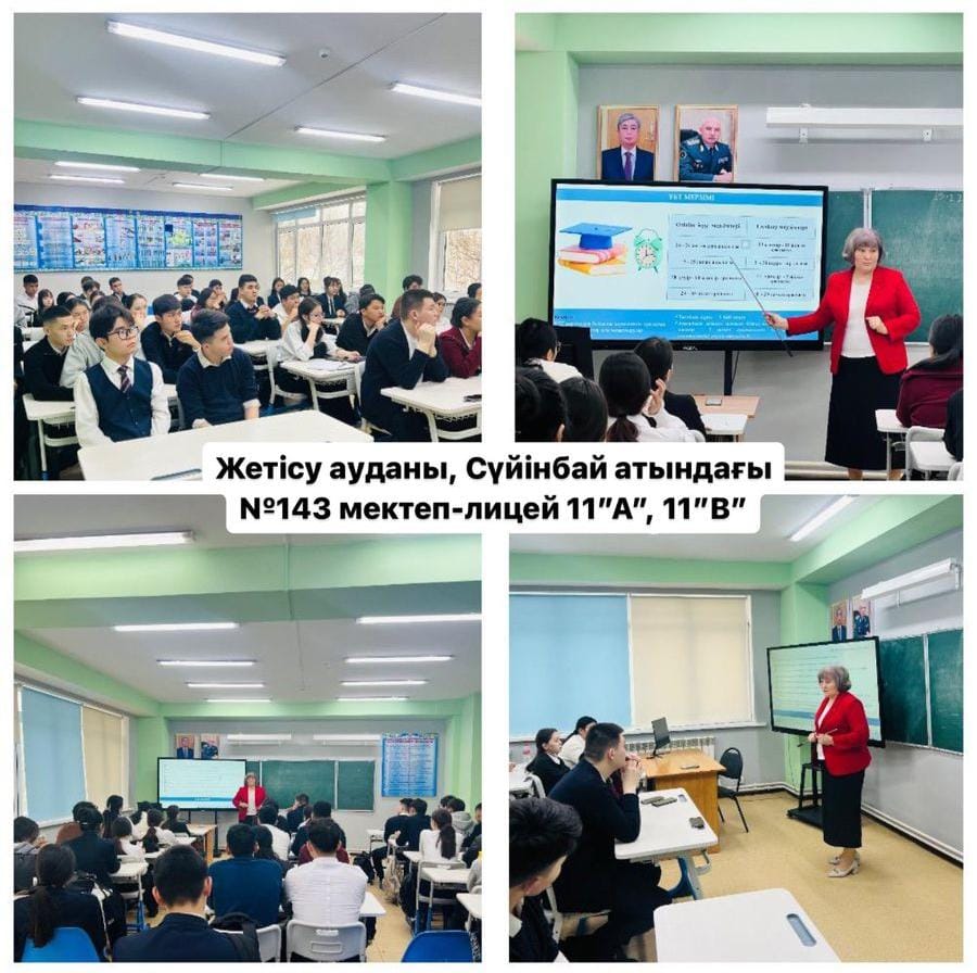 Сүйінбай атындағы №143 мектеп-лицейде мектеп бітіруші түлектермен 2025 жылдағы ҰБТ өткізудің нұсқаулықтар мен ерекшеліктерін таныстыру мақсатында жиналыс болып өтті. Жиналыс барысында директордың оқу ісі жөніндегі орынбасары М.Н. Диханбаева ҰБТ бойынша нормативтік-құқықтық актілермен таныстырып, оқушылар тарапынан қойылған сұрақтарға жауап берді.