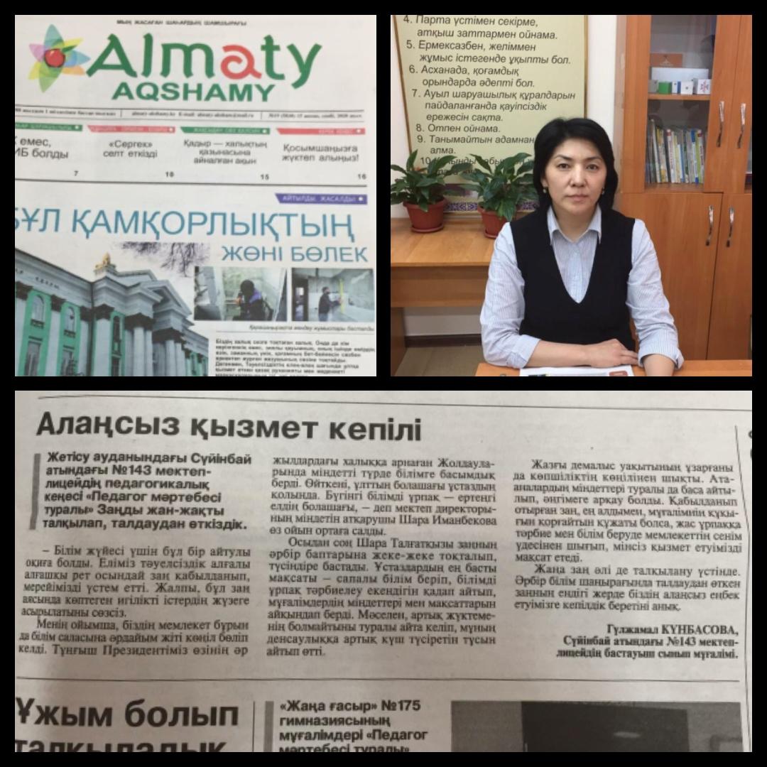 Сүйінбай атындағы №143мектеп-лицейдің бастауыш сынып мұғалімі Г. Күнбасованың Алматы ақшамы газеті 15ақпан 2020ж. күнгі №19 нөмірінде "Алаңсыз қызмет кепілі" тақырыбында мақаласы жарияланды.