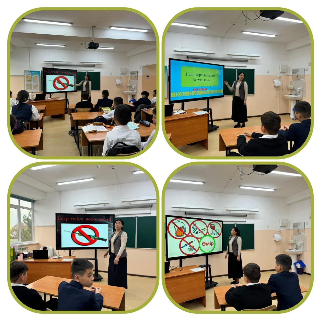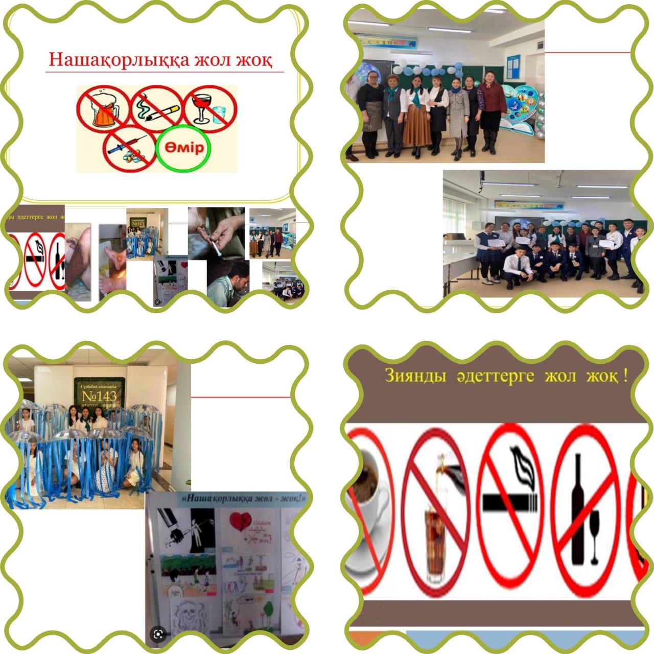 Сүйінбай атынағы №143 мектеп-лицейдің ДТІЖО мен мектеп психологтары 6- 7сынытар арасында ақпарат сағатын өткізілді. Оқушылар «Нашақорлыққа жол жоқ »тақырыпта өткізілді. Нашақорлыққа жол бермейік! Оқушыларды салауатты өмір салтын ұстануға үйрету.Ғасыр дерті болып саналатын зиянды әдеттер – темекі шегу, есірткі заттарды пайдаланудан аулақ болуға шақыру.Адамгершілік, имандылыққа тәрбиелеу