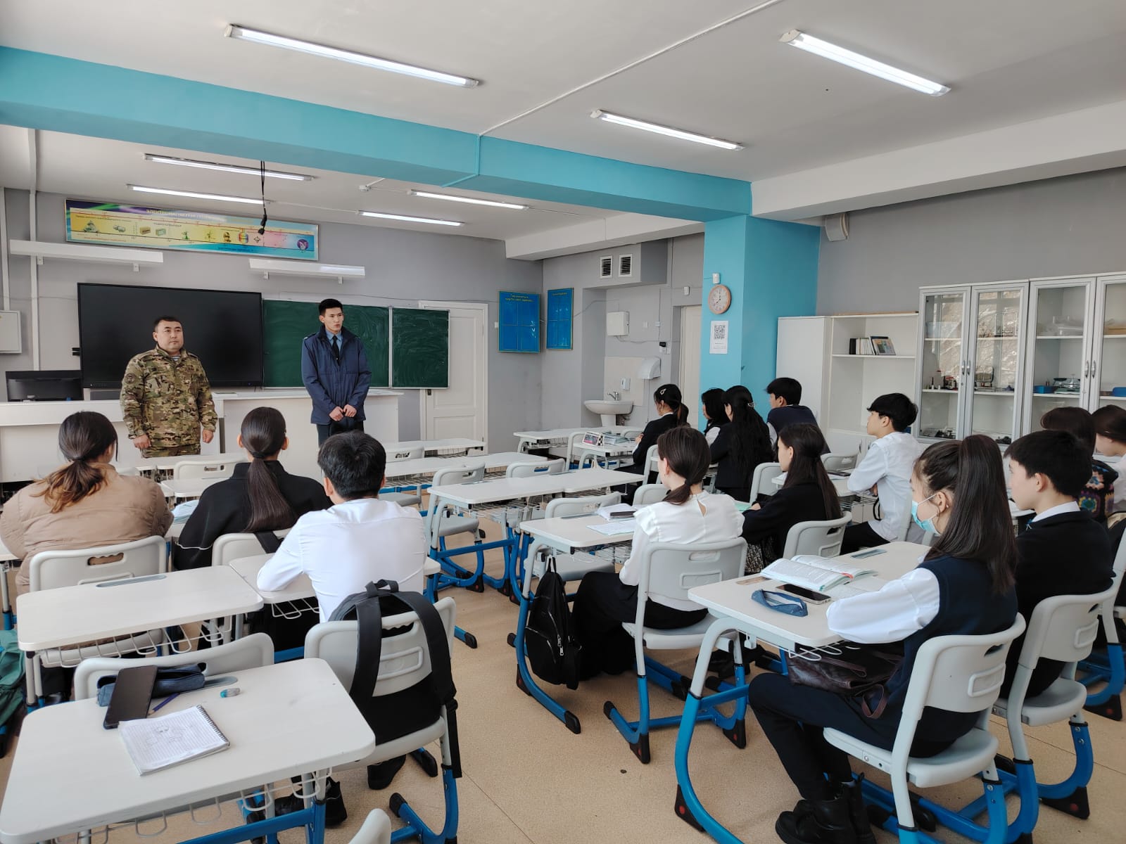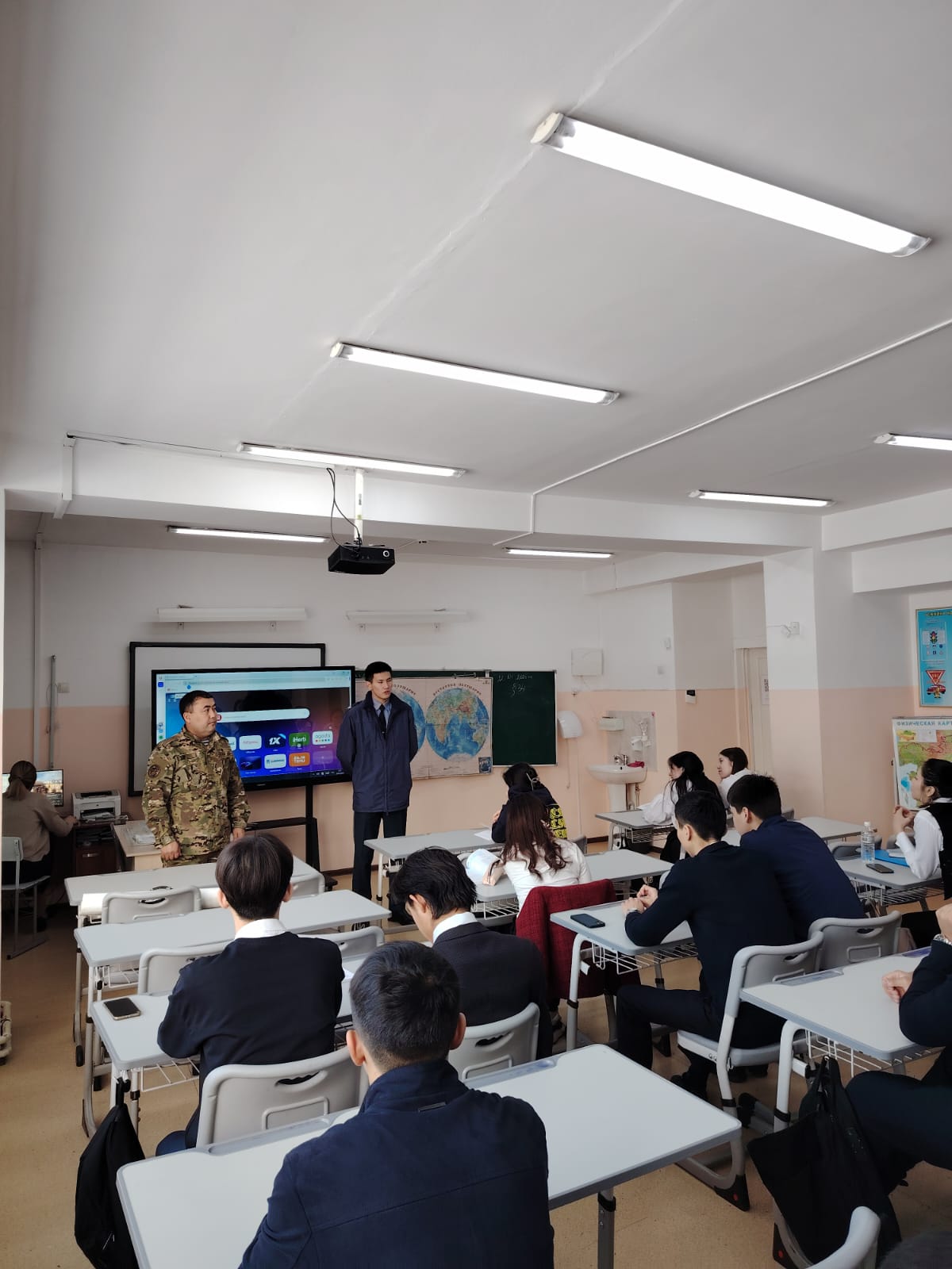 2 курс курсанты полиция кіші сержанты Мауленұлы Саят мектебіміздің түлегі мектепке келіп 10-11 сыныптың оқушыларымен жүздесіп құқық қорғау саласы мен оқу орны туралы үгіт насихат өткізді.