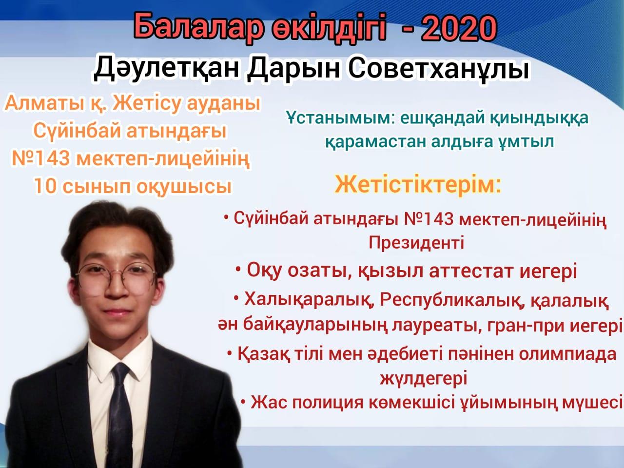 Жетісу ауданы, Сүйінбай атындағы #143 мектеп-лицейінің Жетісу ауданы Білім бөлімінің тапсырмасына сәйкес “БАЛАЛАР ӨКІЛДІКТЕРІН САЙЛАУ” онлайн форматта өткізілді. “Қазақстан Республикасында балалар құқықтарын қамтамасыз ету мәселелері жөніндегі балалар өкілі”, мектепте балалар өкілдіктерін құру мақсатында ұсынылған кандидаттарға дауыс беру қорытындысы бойынша 10”Ә” сынып оқушысы Даулетқан Дарын ауданға ұсынылды.