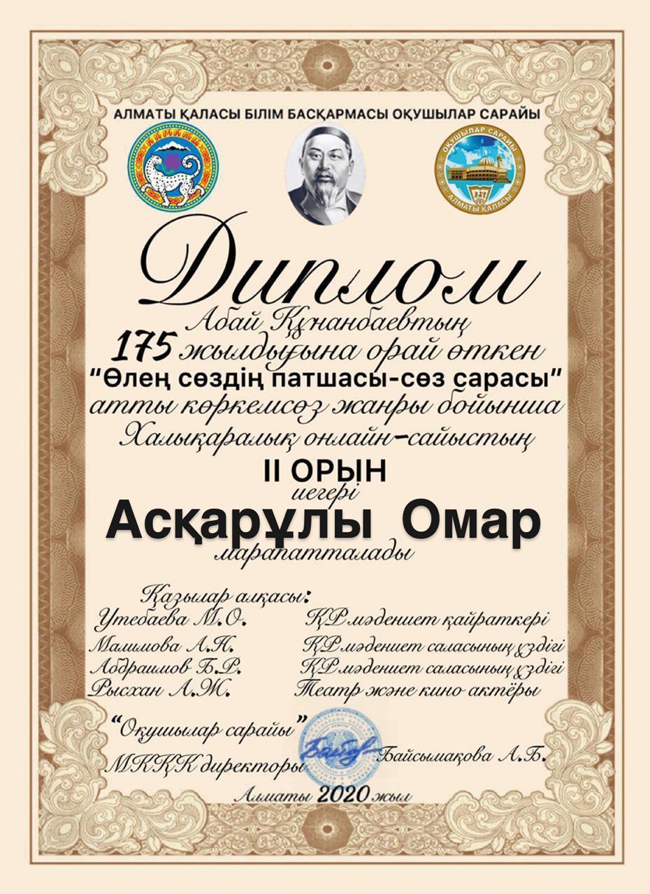 Сүйінбай атындағы №143 мектеп-лицейден Алматы қаласы Білім басқармасы Оқушылар сарайының ұйымдастыруымен өткен «Өлең сөздің патшасы-сөз сарасы» атты Ұлы ақын Абай Құнанбаевтың өлеңдеріне жазылған әндер мен ақынның қара сөздері және өлеңдерін оқудан Халықаралық балалар мен жасөспірімдер арасындағы онлаин байқауға 10 "А" сынып оқушысы Асқарұлы Омар қатысып, ІІ орынды жеңіп алды. Құттықтаймыз! 💐