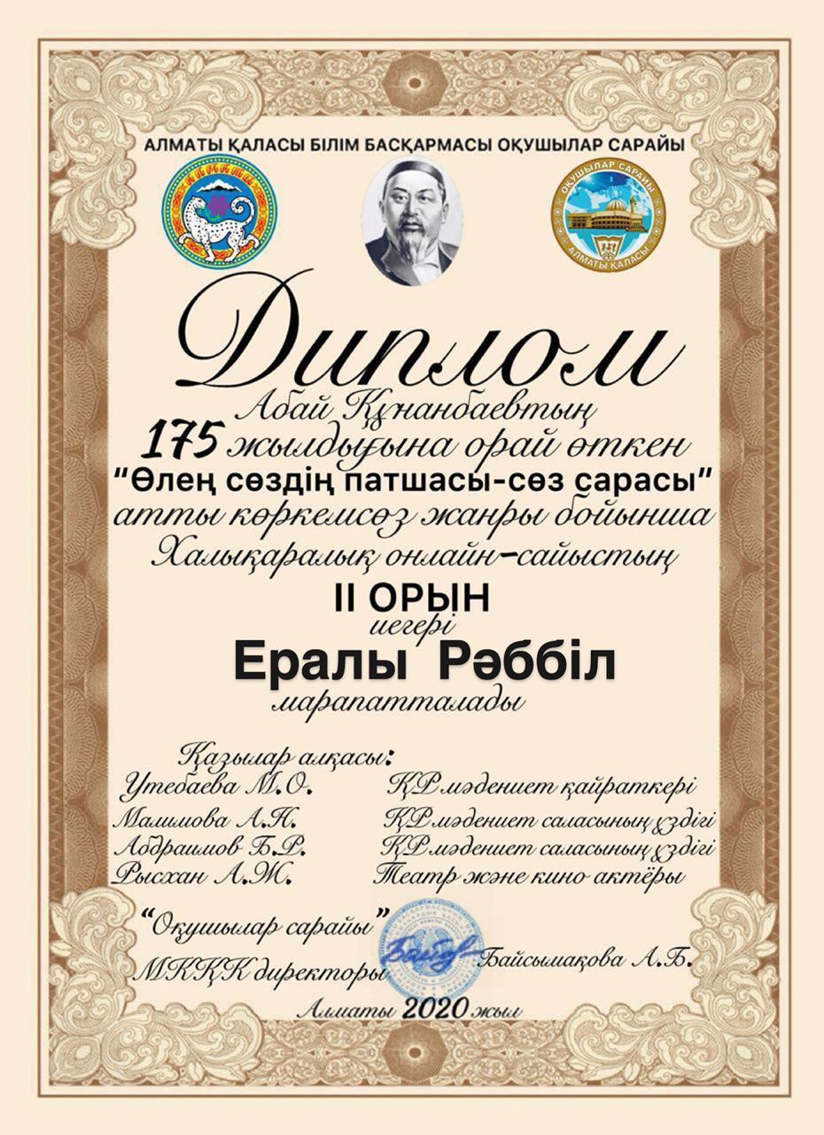 Сүйінбай атындағы №143 мектеп-лицейден Алматы қаласы Білім басқармасы Оқушылар сарайының ұйымдастыруымен өткен «Өлең сөздің патшасы-сөз сарасы» атты Ұлы ақын Абай Құнанбаевтың өлеңдеріне жазылған әндер мен ақынның қара сөздері және өлеңдерін оқудан Халықаралық балалар мен жасөспірімдер арасындағы онлаин байқауға 11"А" сынып оқушысы Ералы Рәббіл қатысып, ІІ орынды жеңіп алды. Құттықтаймыз! 💐