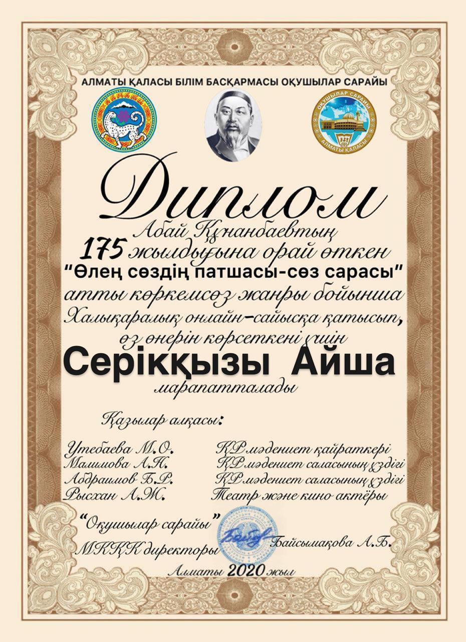 Сүйінбай атындағы №143 мектеп-лицейден Алматы қаласы Білім басқармасы Оқушылар сарайының ұйымдастыруымен өткен «Өлең сөздің патшасы-сөз сарасы» атты Ұлы ақын Абай Құнанбаевтың өлеңдеріне жазылған әндер мен ақынның қара сөздері және өлеңдерін оқудан Халықаралық балалар мен жасөспірімдер арасындағы онлаин байқауға 9 "А" сынып оқушысы Серікқызы Айша өз өнерін көрсеткені үшін дипломмен марапатталды. Құттықтаймыз! 💐