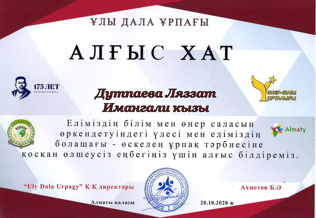 21 октябрь 2020 0 1 2 3 4 5 Абай оқулары Құттықтаймыз!! 3 "А" сынып оқушысы Аманбаев Рахат А.Құнанбаевтың 175 жылдық мерей тойына орай "Абай оқулары" атты байқауының жеңімпазы. Жетекшісі: Дутбаева Ляззат Иманғалиқызы Осы беттің QR-коды:QR-код этой страницы:
