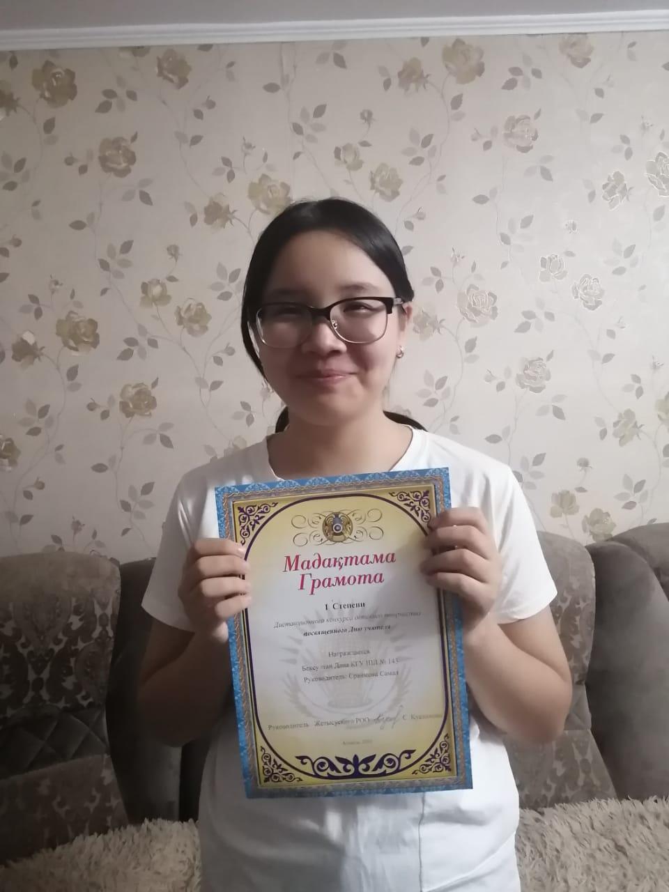Сүйінбай атындағы №143 мектеп-лицейдің 9"Б" сынып оқушысы Бексұлтан Дана Жетісу ауданы бойынша мұғалімдер күніне орай оқушылар арасында өткен сурет байқауына қатысып, жүлделі Іорынға ие болды. Жетекшісі: Сраймова Самал Сағатқызы