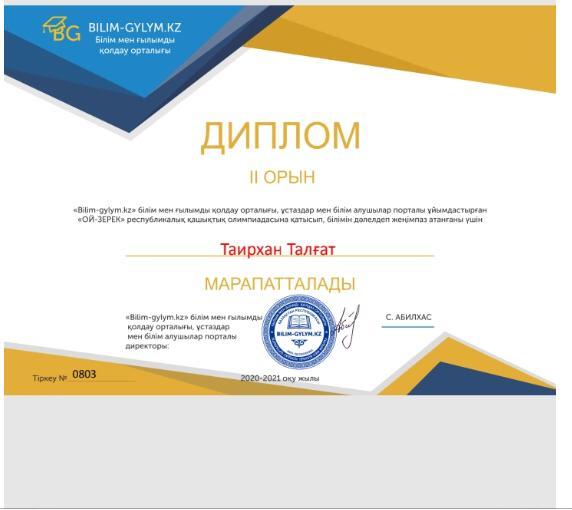 Сүйінбай атындағы 143 мектеп-лицейдің 4 "А" сынып оқушылары BILIM-GYLYM.KZ ұйымдастырған "ОЙ ЗЕРЕК" республикалық қашықтық олимпиадасынан Таирхан Талғат ІІ орын және Бекзақ Бейбарыс ІІІ орын дипломымен марапатталды. Жетекшісі: Турапбаева Қарлығаш