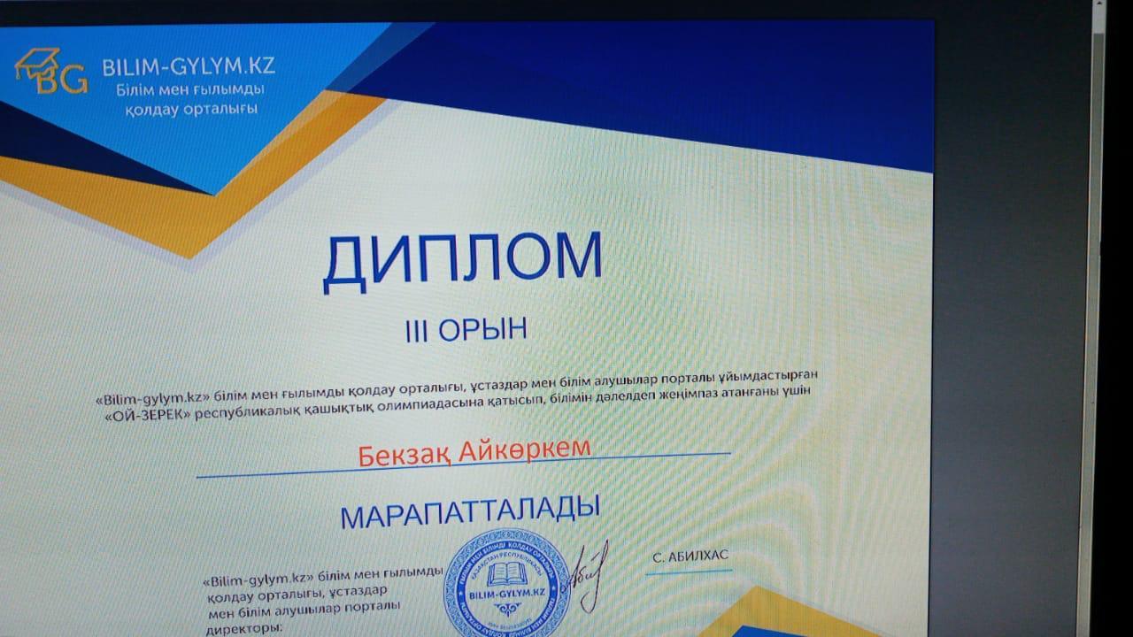 Сүйінбай атындағы 143 мектеп-лицейдің 3 "А" сынып оқушылары BILIM-GYLYM.KZ ұйымдастырған "ОЙ ЗЕРЕК" республикалық қашықтық олимпиадасынан Ботабаев Даулет ІІІ орын, Бекзақ Айкөркем ІІІ орын дипломымен және Сапаш Айзере белсене қатысқаны үшін сертификатпен марапатталды. Жетекшісі: Дутбаева Лазат