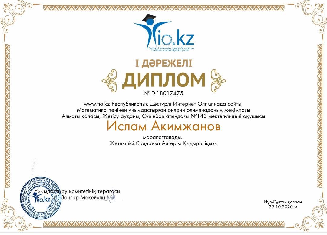 Сүйінбай атындағы 143 мектеп-лицейдің 1 "Г" сынып оқушысы Акимжанов Ислам математика пәні бойынша kio.kz Республикалық Дәстүрлі интернет олимпиадада ІІ дәрежелі дипломымен марапатталды. Жетекшісі: Сайдаева Айгерім