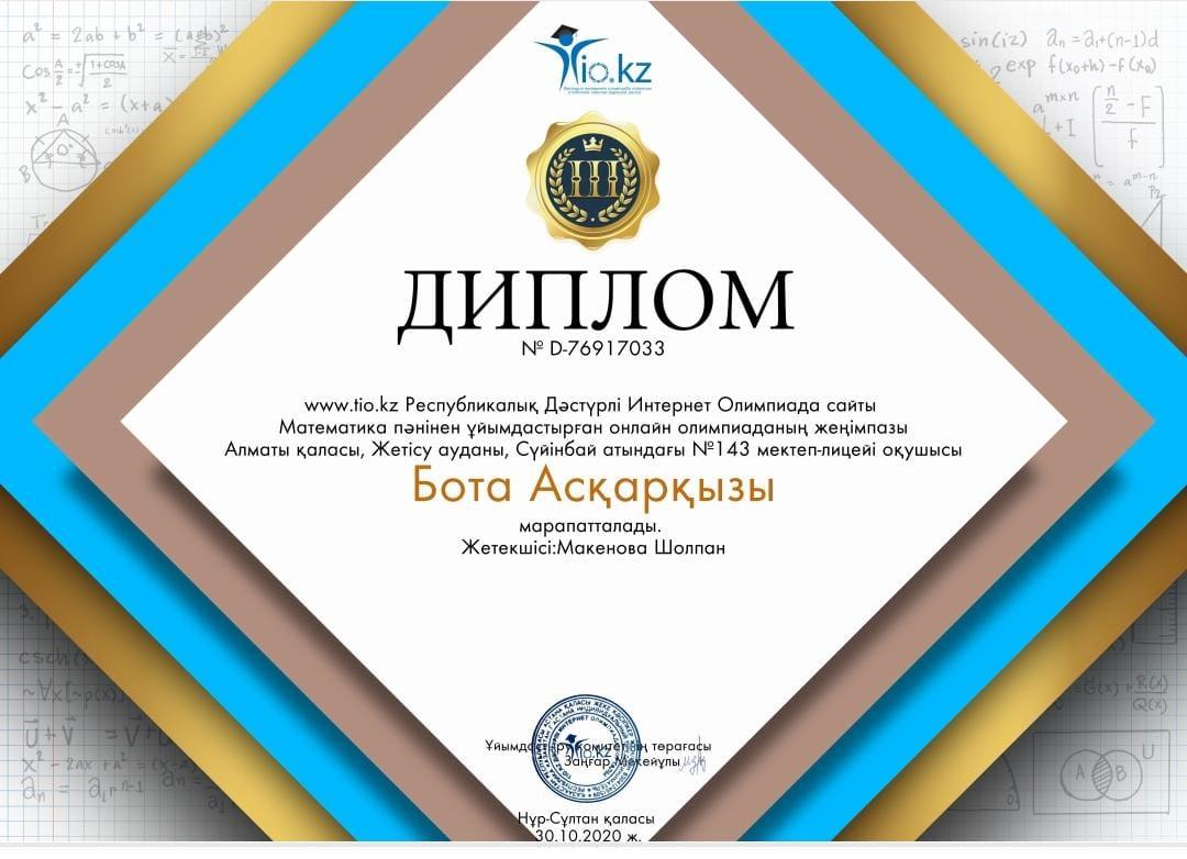 Сүйінбай атындағы №143 мектеп-лицейдің 1"Ә" сынып оқушысы Асқарқызы Бота Nio.kz Республикалық Дәстүрлі Интернет Олимпиада сайтының ұйымдастыруымен математика пәнінен ұйымдастырылған олимпиадада ІІІ орынға ие болды.