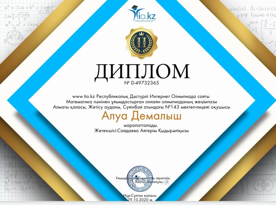 Сүйінбай атындағы 143 мектеп-лицейдің 1 "Г" сынып оқушылары Демалыш Алуа және Бурабай Заманбек математика пәні бойынша kio.kz Республикалық Дәстүрлі интернет олимпиадада ІІ дәрежелі дипломымен марапатталды. Жетекшісі: Сайдаева Айгерім