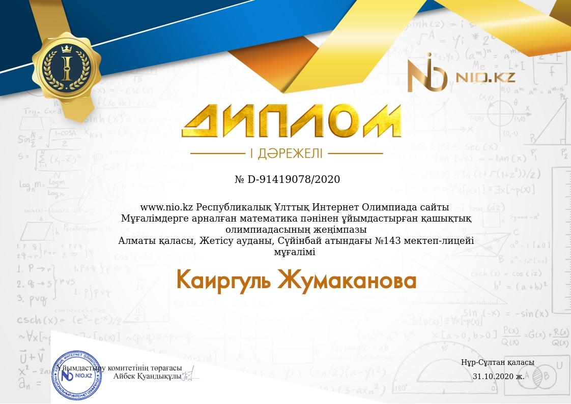 143 Сүйінбай атындағы мектеп-лицейдің математика пәні мұғалімі К.Жумаканова www.nio.kz Республикалық Ұлттық Интернет Олимпиада сайтында мұғалімдерге арналған математика пәнінен ұйымдастырылған қашықтық олимпиадасының І дәрежелі жеңімпазы атанды.