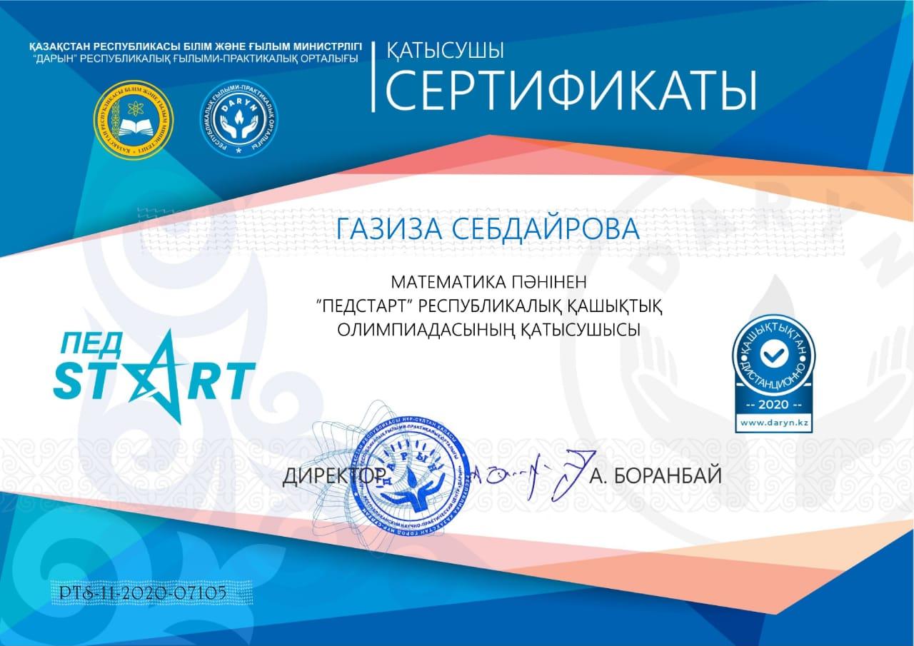 ҚР БІЛІМ және ҒЫЛЫМ МИНИСТРЛІГІ "ДАРЫН" РЕСПУБЛИКАЛЫҚ ҒЫЛЫМИ-ПРАКТИКАЛЫҚ орталығының ұйымдастыруымен өткен математика пәнінен "ПЕДСТАРТ" республикалық қашықтық олимпиадасына #143 Сүйінбай атындағы мектеп-лицейдің математика пәні мұғалімі Себдайырова Ғазиза Манапқызы қатысып, І дәрежелі дипломмен марапатталды