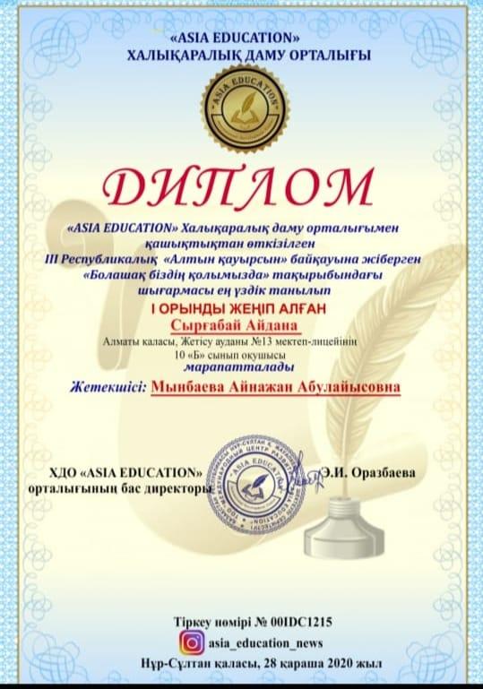 Алматы қаласы Жетісу ауданы Сүйінбай атындағы #143 мектеп-лицейінің 10 "Б" сынып оқушысы Сырғабай Айдана "ASIA EDUCATION" Халықаралық даму орталығымен қашықтықтан өткізілген ІІІ Республикалық "Алтын қауырсын" байқауына жіберген "Болашақ біздің қолымызда" тақырыбындағы шығармасы ең үздік танылып І орын дипломымен марапатталды. Жетекшісі: Мынбаева Айнажан. Құттықтаймыз 🌹🌹🌹