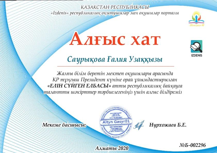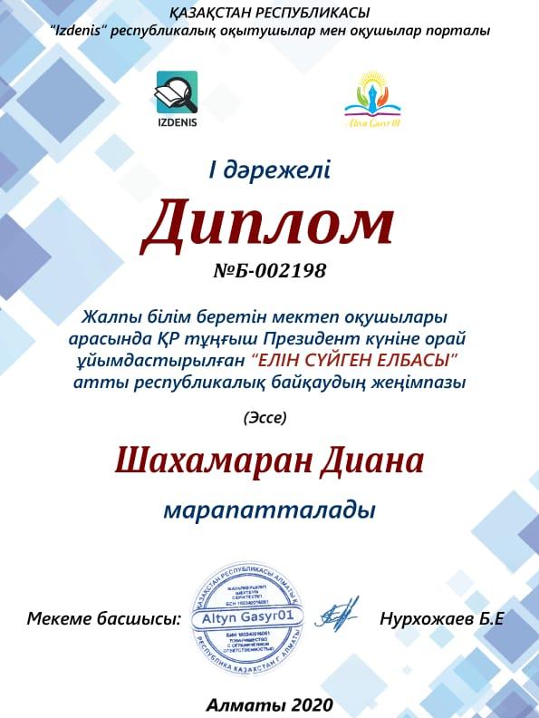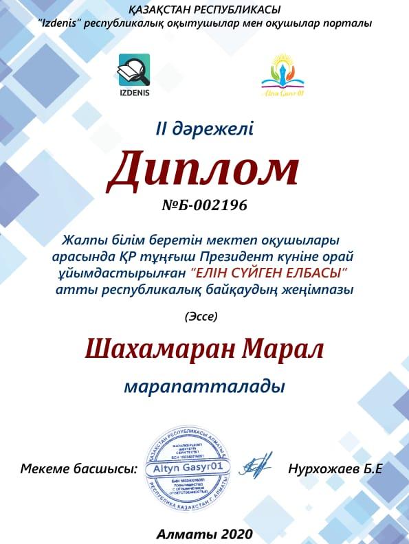 Жалпы білім беретін мектеп оқушылары арасында ҚР Тұңғыш Президенті күніне орай ұйымдастырылған "ЕЛІН СҮЙГЕН ЕЛБАСЫ" атты республикалық байқаудың жеңімпазы мектебіміздің 7 "А" сынып оқушысы Шахамаран Марал ІІ дәрежелі және 5 "Б" сынып оқушысы Шахамаран Диана І дәрежелі дипломмен марапатталды. Жетекшісі: Саурықова Ғалия Құттықтаймыз 🌹🌹