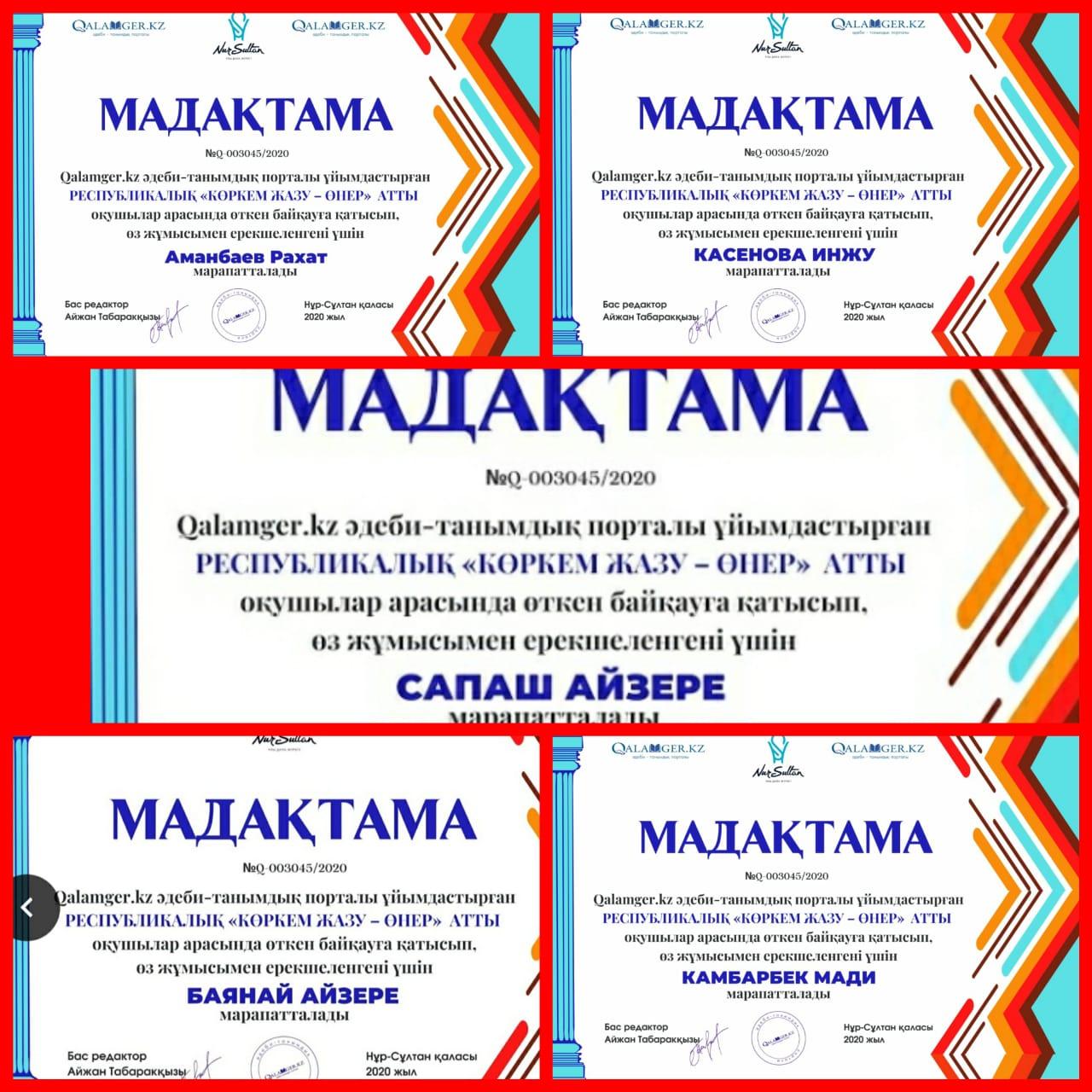 Qalamger.kz әдеби-танымдық порталы ұйымдастырған РЕСПУБЛИКАЛЫҚ "КӨРКЕМ ЖАЗУ -ӨНЕР" атты оқушылар арасында өткен байқауға қатысып, өз жұмысымен ерекшеленгені үшін мектебіміздің 3 "А" сынып оқушылары Аманбаева Рахат, Касенова Інжу, Сапаш Айзере, Баянай Айзере, Қамбарбек Мади марапатталды. Жетекшісі Дутбаева Ләззәт.
