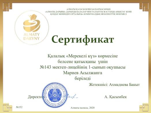 25 декабрь 2020 0 1 2 3 4 5 ALMATY DARYNY Қалалық "Мерекелі күз" көрмесіне белсене қатысқаны үшін мектебіміздің 1 "А"сынып оқушысы Мариев Асылжанға және 3 "Г" сынып оқушысы Абилкайыр Перизатқа сертификат берілді. Жетекшілері Ахмадиева Бахыт, Темешова Альбина Осы беттің QR-коды:QR-код этой страницы: